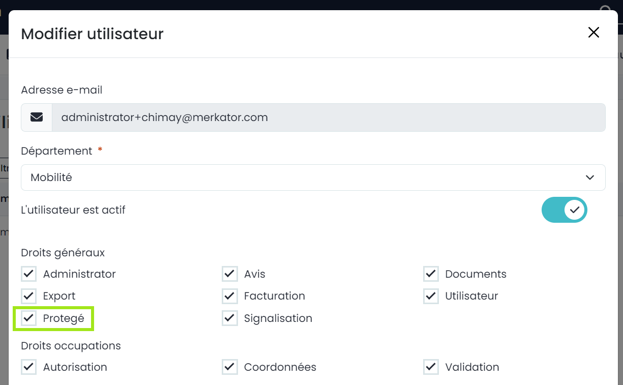 En tant qu'utilisateur, vous devez disposer du droit « Protégé ». Vous pouvez le configurer sous Gestion -> Utilisateurs.