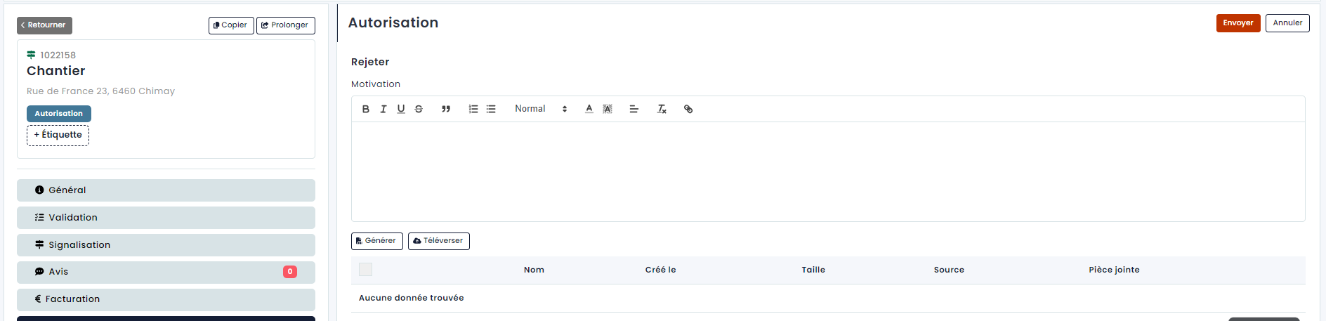 Si vous souhaitez désapprouver le dossier, vous pouvez également sélectionner cette option. Vous pouvez ajouter une motivation qui sera communiquée au demandeur, ainsi qu'envoyer un modèle. Dès que vous cliquez sur « Envoyer », le statut du dossier devient « Rejeté » et un e-mail de rejet est envoyé au demandeur avec la motivation.