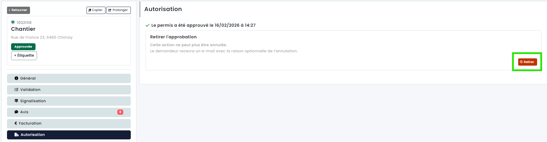 Une fois que vous avez approuvé le dossier, vous avez également la possibilité de retirer l'approbation. Lors du retrait, vous pouvez également fournir une motivation et envoyer des documents au demandeur.
