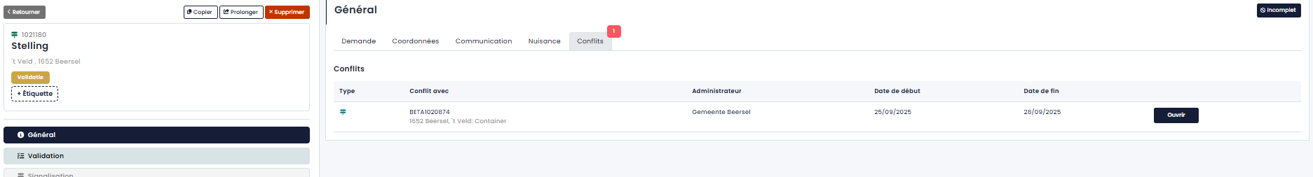 Attention : la nuisance sauvegardée ici sera transmise à GIPOD (clients Flamands).2.5 Conflits