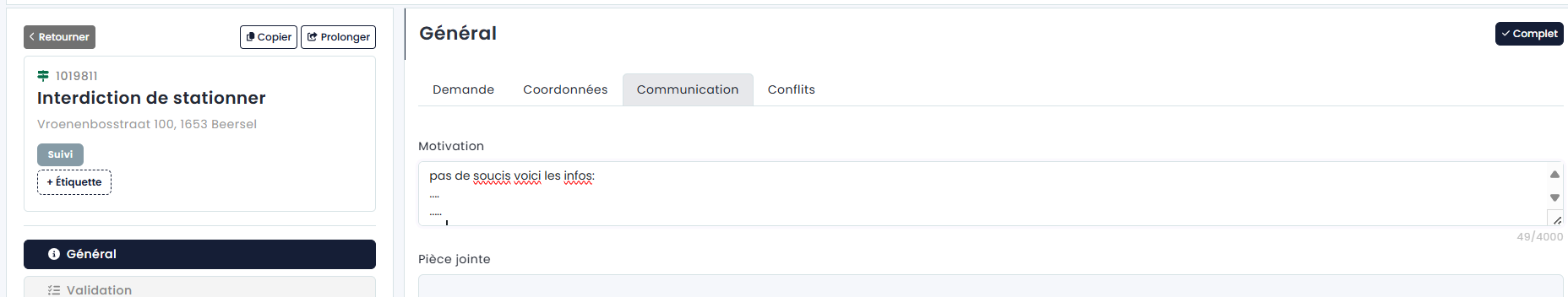 ATTENTION: la communication avec le demandeur n'est possible que lorsque le dossier est incomplet (statut Suivi, Feedback ou Modifié). Une fois que le gestionnaire du dossier déclare le dossier complet, le demandeur ne peut plus répondre aux messages ni modifier la demande. 2.4 Nuisance