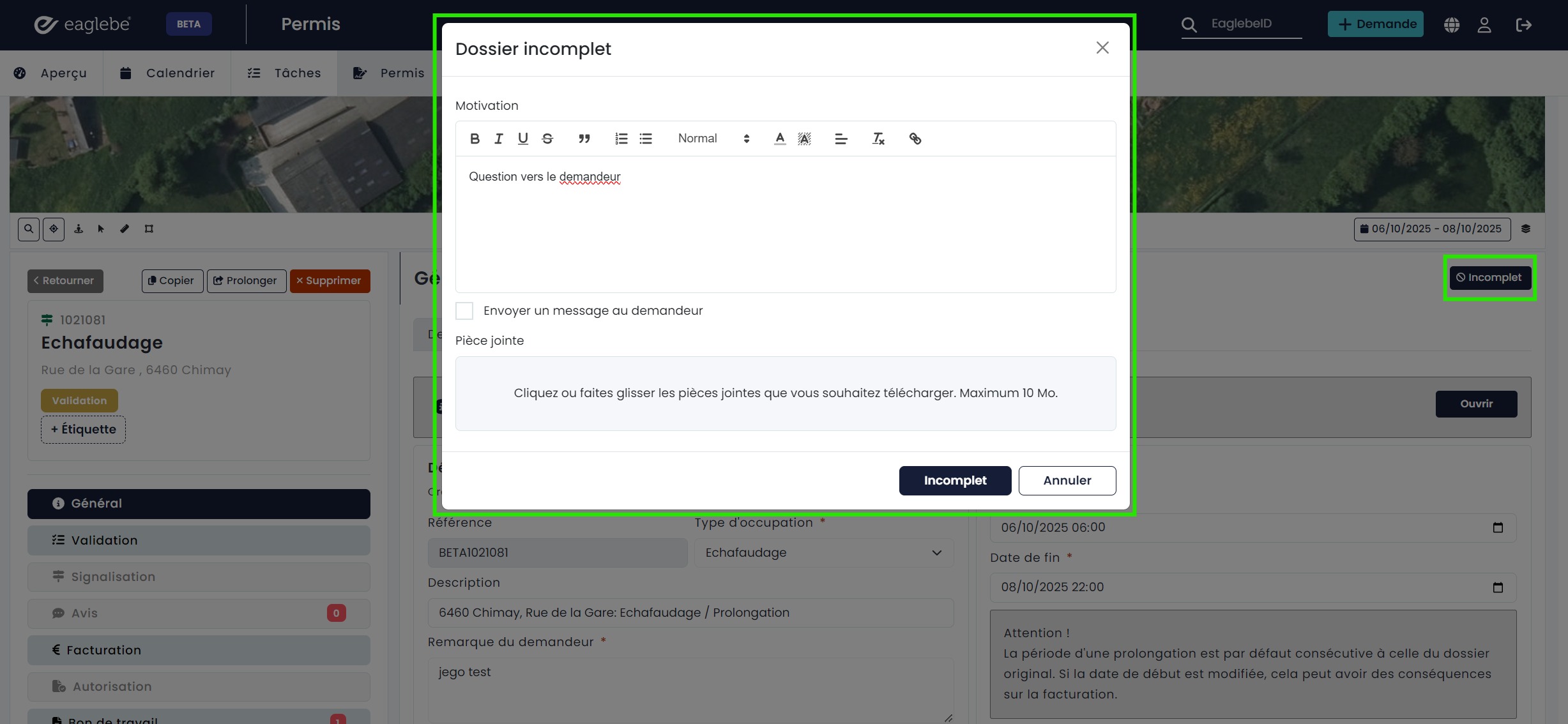 La demande ou les coordonnées sont incomplètes, vous avez besoin d'une pièce jointe supplémentaire ou le demandeur doit encore modifier sa demande ? Dans ce cas, vous pouvez établir une communication avec le demandeur via Eaglebe. Pour ce faire, vous devez marquer le fichier comme incomplet en cliquant sur le bouton similaire dans le coin supérieur droit du menu général. Ce bouton est disponible à partir de n'importe quel onglet de ce menu.
