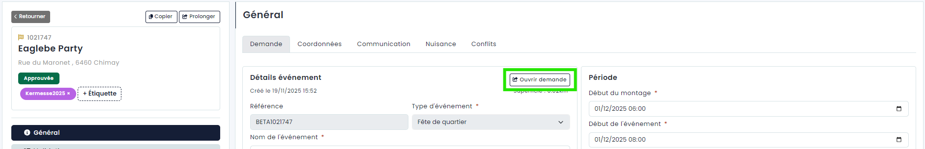 Cet onglet contient tous les détails généraux de l'événement, la période, l'adresse, etc. Vous trouverez le formulaire de demande complet en cliquant sur le bouton « Ouvrir demande ».
