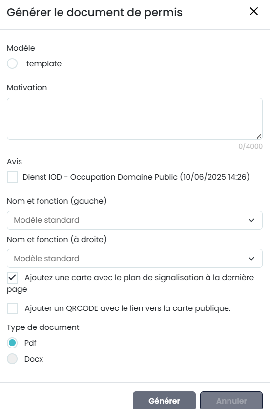 Vous choisissez le document souhaité, ajoutez éventuellement une motivation (plus d'informations ci-dessous), un nom/une fonction et choisissez d'ajouter ou non un plan (zone et signalisation) à la dernière page du permis. Vous cliquez ensuite sur “Générer” et le modèle sera rempli par Eaglebe.