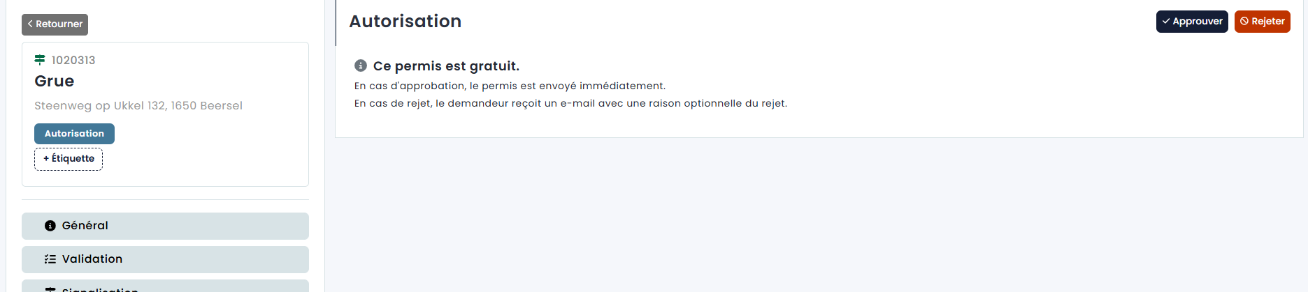 Si vous souhaitez désapprouver le dossier, vous pouvez également sélectionner cette option. Vous pouvez ajouter une motivation qui sera communiquée au demandeur, ainsi qu'envoyer un modèle. Dès que vous cliquez sur « Envoyer », le statut du dossier devient « Rejeté » et un e-mail de rejet est envoyé au demandeur avec la motivation.