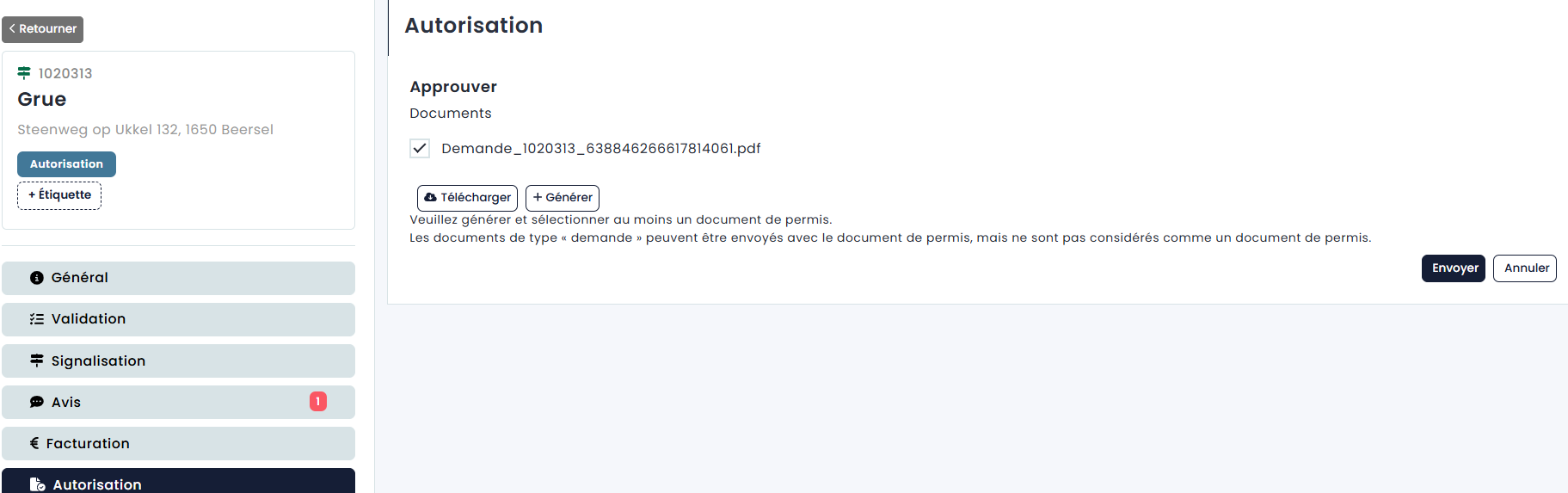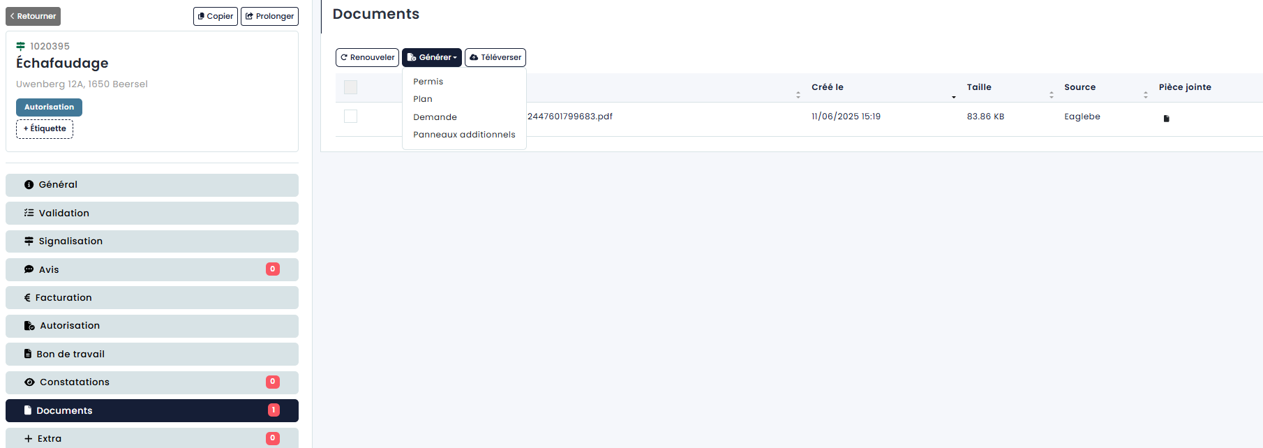 Lorsque vous cliquez sur « Approuver », vous n'envoyez pas immédiatement la demande de permis ou de paiement. Cependant, un aperçu de tous les documents qui ont été ajoutés à la demande apparaîtra, ainsi que le bouton “Générer” avec lequel vous pouvez faire remplir un document de permis par Eaglebe (pour en savoir plus sur les modèles, voir Gestion - Documents). Sur ce document, Eaglebe peut remplir les détails de la demande spécifique (période, lieu,...) et du demandeur (nom, adresse,...).