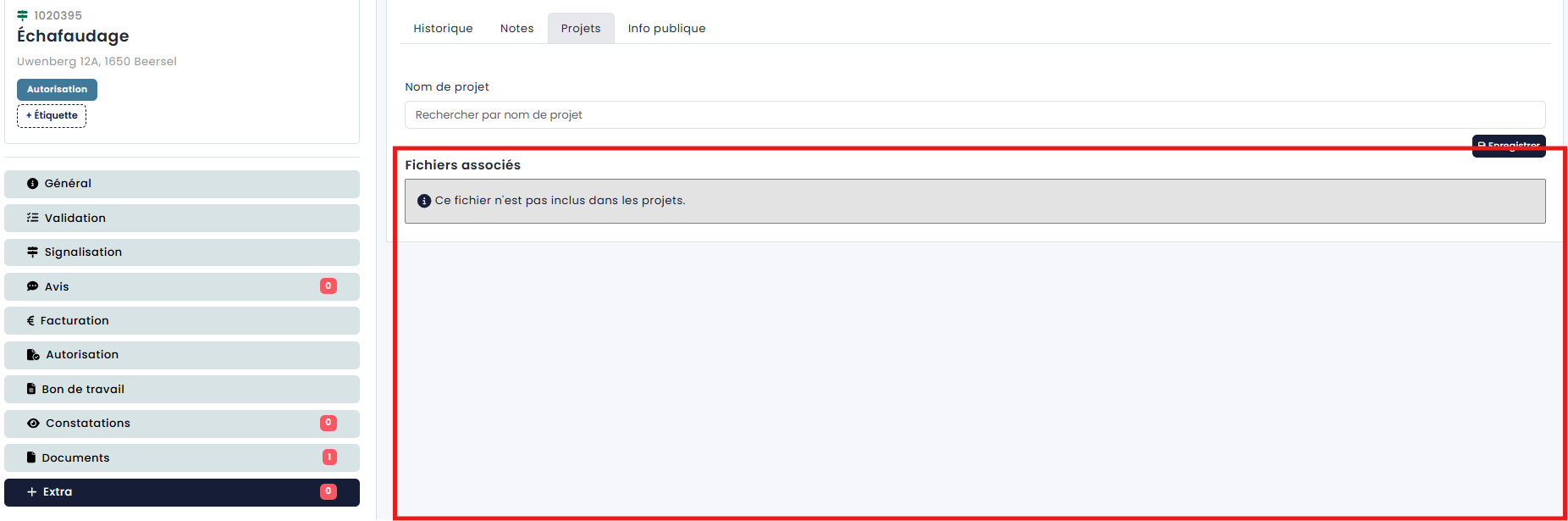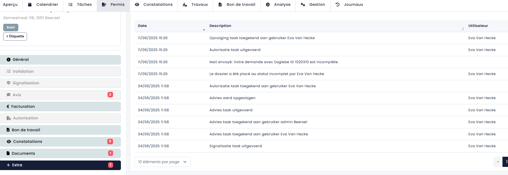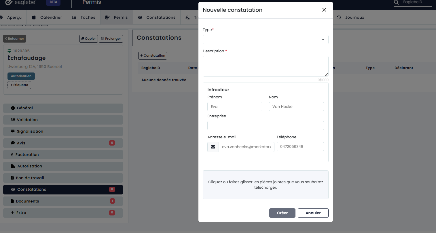 Pour le suivi des permis, Eaglebe offre la possibilité de créer des observations. Dans chaque dossier, vous avez la possibilité de signaler une détermination via l'onglet “Déterminations”. Si une violation est constatée pour une occupation spécifique, elle peut facilement être enregistrée de cette manière.