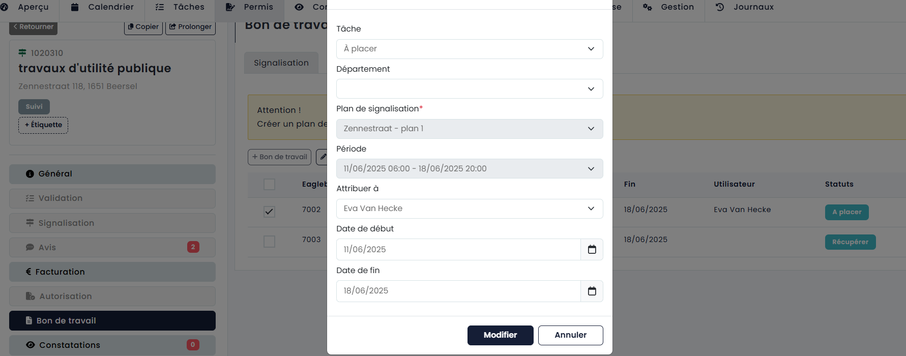 Pour chaque occupation, des bons de travail peuvent également être créés pour placer la signalisation correspondante ou pour vérifier la prise d'eau sur le terrain.