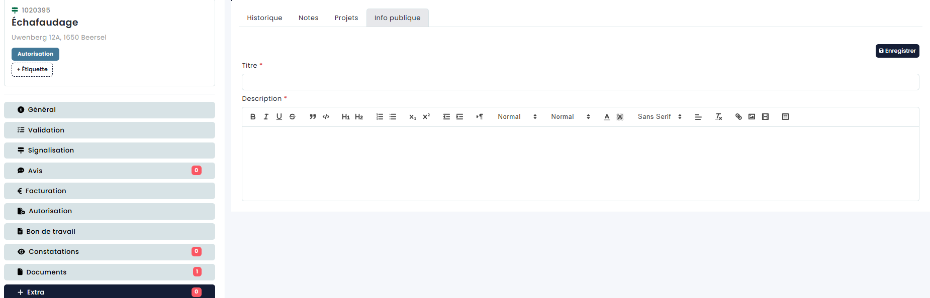 Dans l'onglet Nuisance, vous trouverez la nuisance indiquée par le demandeur lors de la demande d'occupation. En dessous, vous pouvez modifier ou étendre la nuisance. Ces modifications peuvent être sauvegardées à l'aide du bouton Enregistrer situé en bas à droite de l'onglet Nuisance.