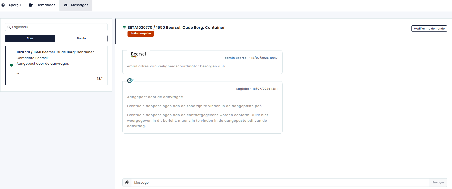 Notez que vous ne pouvez envoyer des messages ou modifier votre demande que pour les dossiers qui nécessitent une action. Les dossiers en cours ou déjà terminés ne peuvent pas être modifiés.