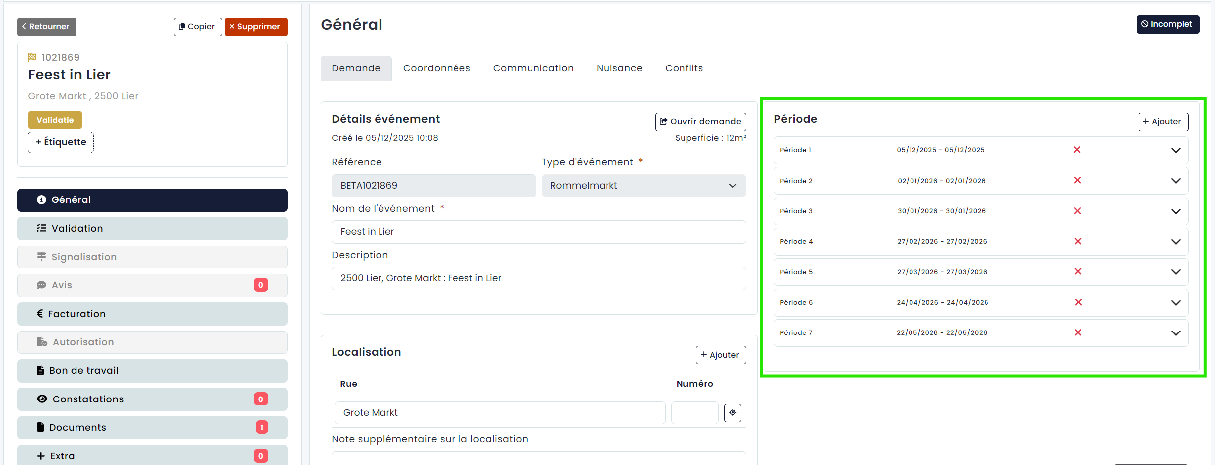 Le traitement d'un événement récurrent est totalement analogue au traitement d'un événement standard (plus d'informations ici). La seule différence est qu'un dossier contient plusieurs périodes, qui peuvent être trouvées sous l'onglet Demande - Périodes.