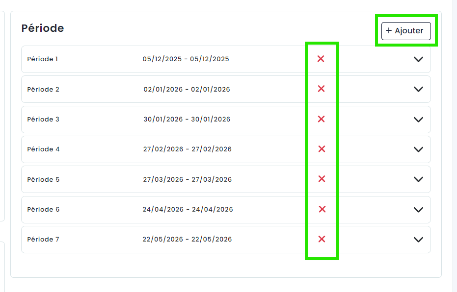 À partir de là, vous pouvez également supprimer des périodes de la demande en cliquant sur le croix rouge située à côté de la période ou ajouter de nouvelles périodes en cliquant sur l'icône '+ Ajouter' située en haut à droite de l'aperçu des périodes. Les périodes supprimées restent disponibles dans l'aperçu mais sont barrées pour indiquer qu'elles ne sont plus actives. Si nécessaire, vous pouvez toujours les réactiver à partir d'ici via l'icône plus à côté de la période.