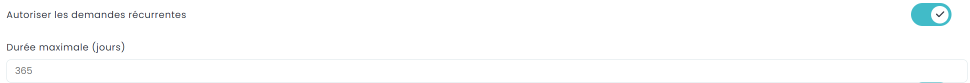La case à cocher "Permettre des demandes récurrentes" vous permet de spécifier plusieurs périodes pour ce type d'événement dans le cadre d'une même demande. En outre, vous devrez également spécifier la durée maximale (en jours calendriers). Il s'agit de la durée maximale d'un événement récurrent entre la première date de début et la dernière date de fin. De cette manière, vous pouvez limiter les événements récurrents de sorte qu'aucun événement hebdomadaire d'une durée de 10 ans ne soit demandé.