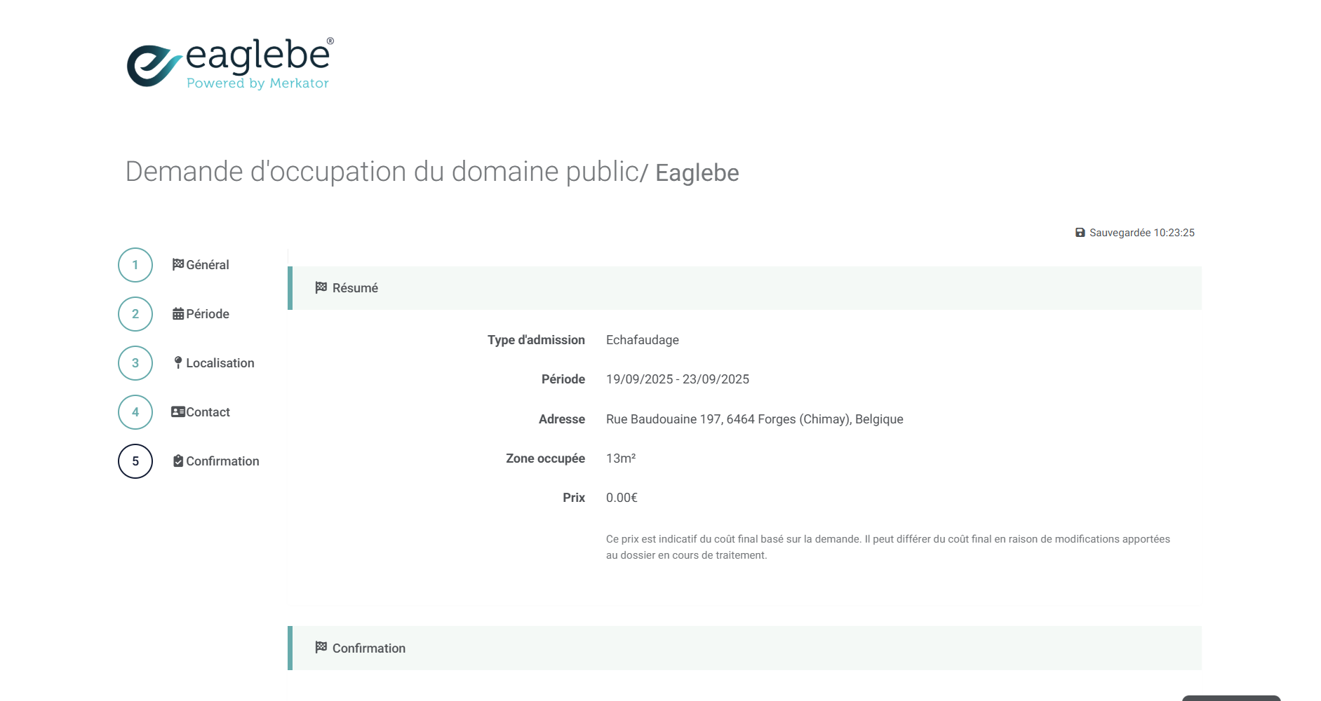 - Souhaitez-vous donner au demandeur un résumé de son occupation, avec le type, la surface occupée, la période et le prix de revient indicatif avant la soumission de la demande ? Vous pouvez l'activer via le slider « Afficher le résumé lors de la confirmation de la demande occupation domaine public ».