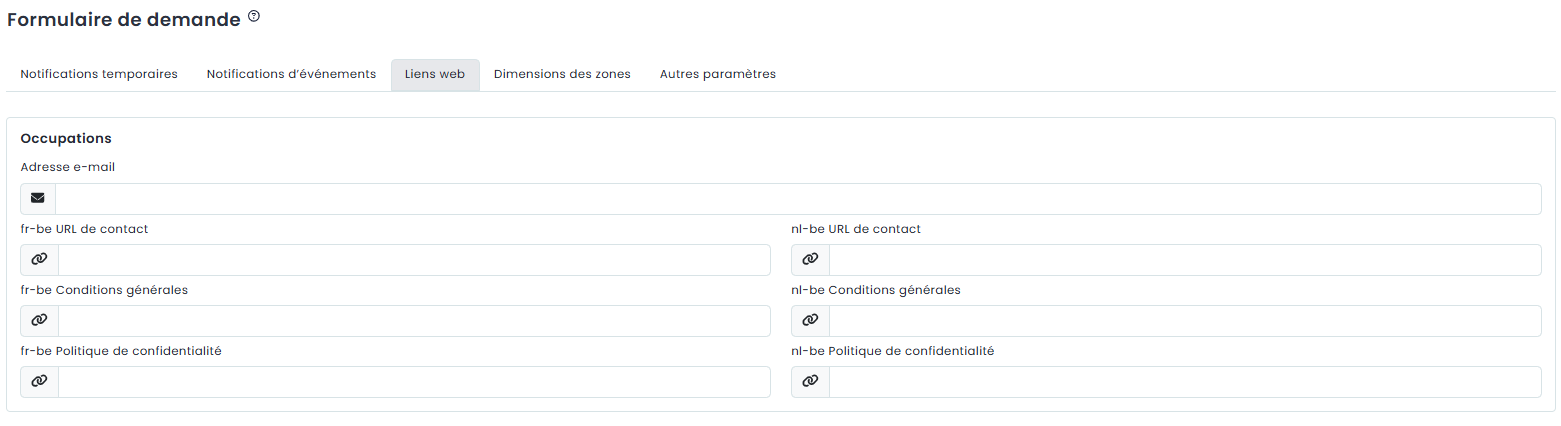 Sur le formulaire de demande et dans l'e-mail de confirmation envoyé, il est fait mention de certains liens standard. Ces liens renvoient le demandeur vers des informations pertinentes (coordonnées, conditions générales,...) concernant sa demande. Les liens auxquels il est fait référence peuvent être adaptés dans Eaglebe lui-même sous Gestion' -> Formulaire de Demande -> Liens web.
