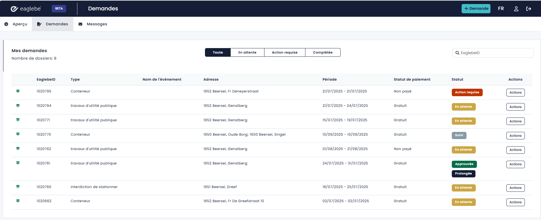Le menu des demandes offre une vue d'ensemble claire de toutes les demandes introduites dans un tableau bien ordonné. Les données suivantes sont affichées pour chaque demande :