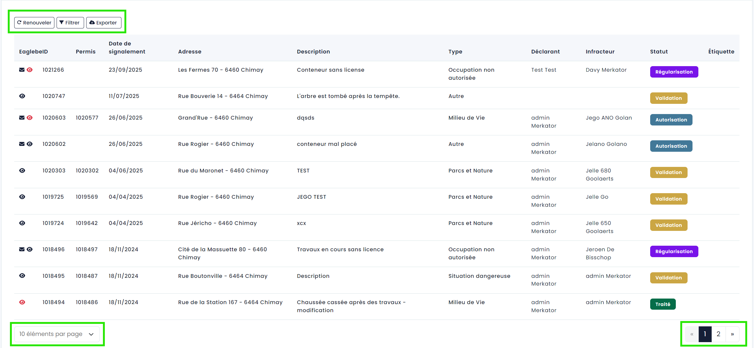 - La date de notification, l'EaglebeID, les coordonnées, le statut, le type, l'étiquette, l'emplacement, le statut de paiement, si l'observation est une infraction et s'il y a une régularisation associée.