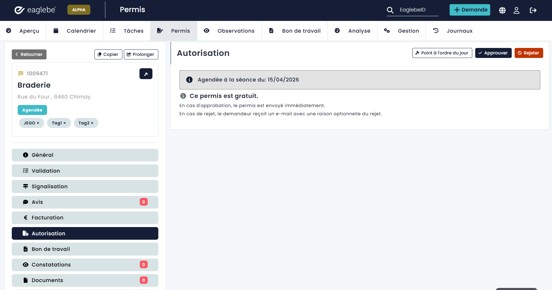 Une fois la date de séance passée, le dossier Eaglebe repasse au statut Autorisation. Il est alors prêt à être approuvé ou refusé définitivement selon le flux standard. Les permis et décisions nécessaires peuvent être joints à ce moment-là.