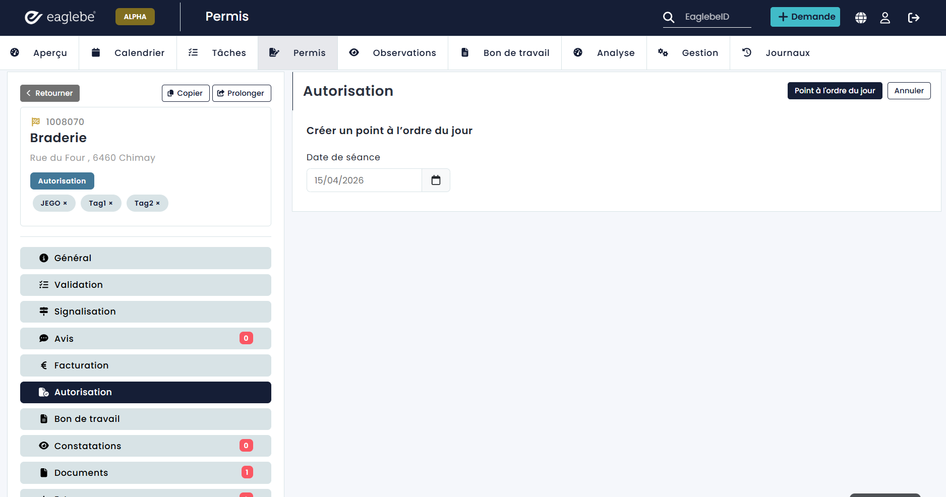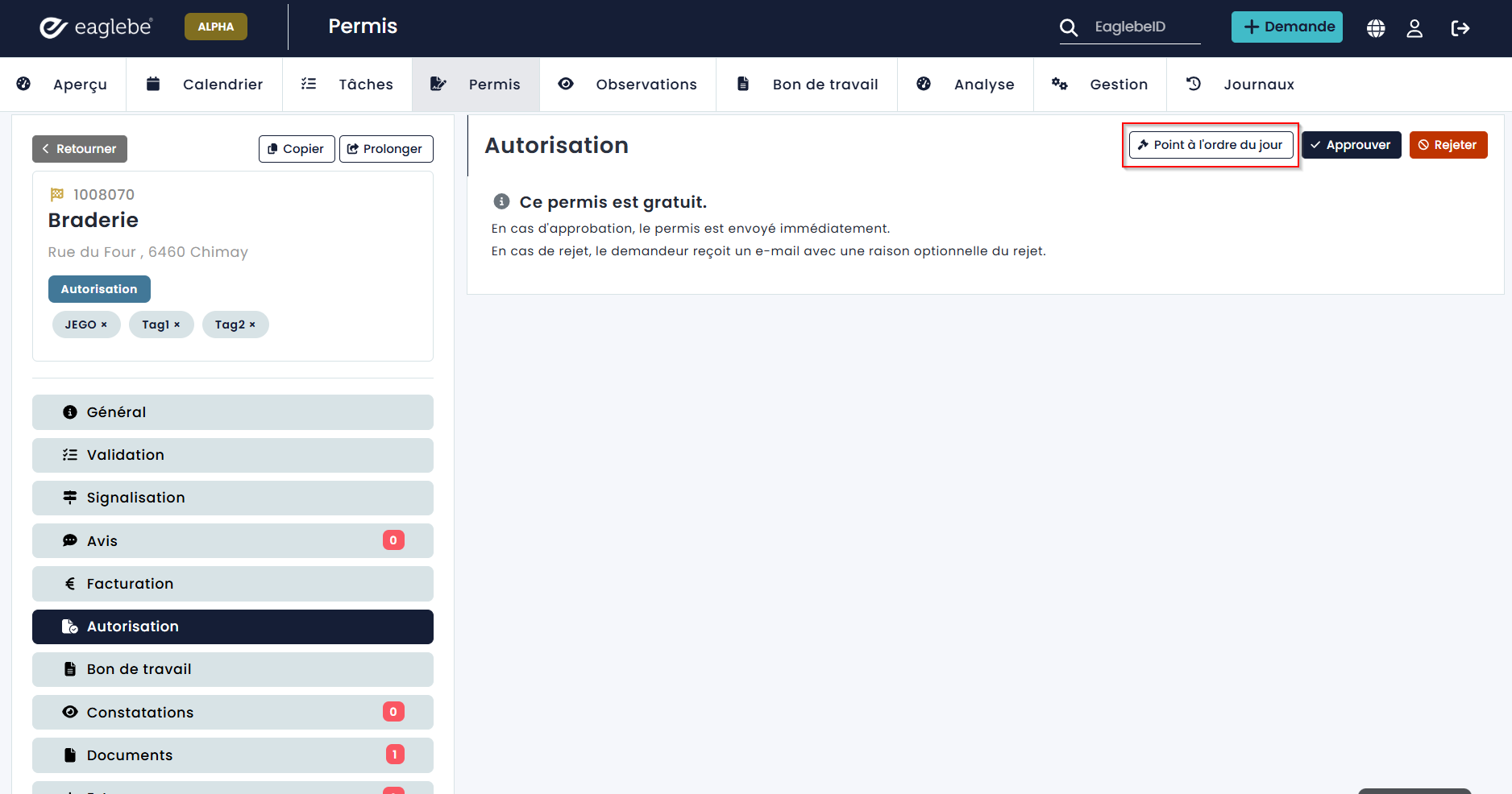 Un dossier Eaglebe ne peut être mis à l’ordre du jour que lorsqu’il est entièrement traité et qu’il se trouve au statut Autorisation (juste avant l’approbation ou le refus). Pour mettre un dossier à l’ordre du jour, ouvrez le dossier et allez dans le menu Autorisation. Vous avez alors le choix, au lieu d’approuver ou de refuser immédiatement le dossier, de le mettre d’abord à l’ordre du jour via le bouton « Point à l’ordre du jour ».