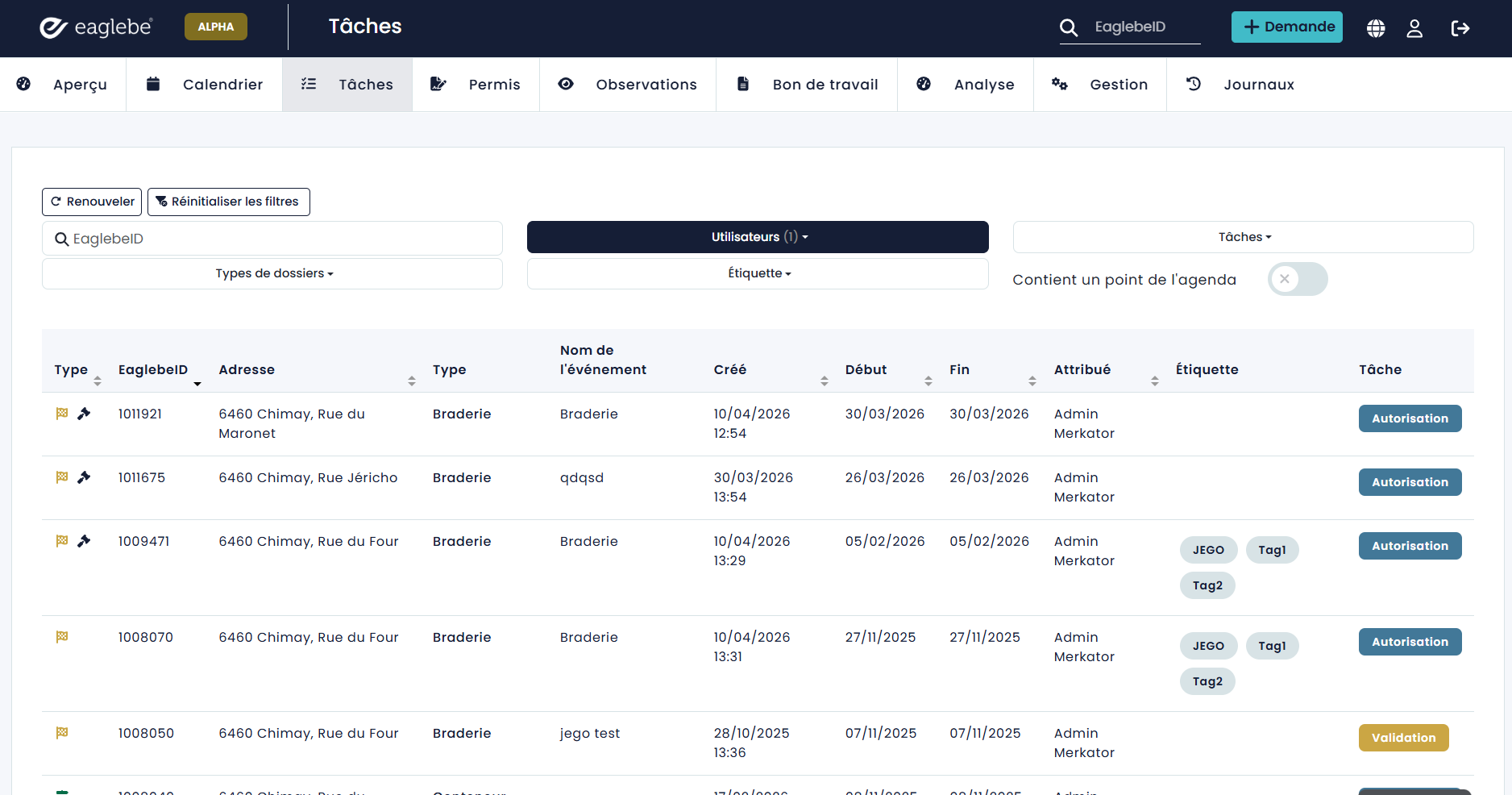 Un dossier au statut « Mis à l’ordre du jour » se trouve dans une sorte de statut d’attente au sein d’Eaglebe. En effet, aucune action ne doit être effectuée sur la plateforme Eaglebe dans ce statut. Il s’agit plutôt d’une indication que le dossier a été inscrit à l’ordre du jour et qu’il attend la décision du collège ou d’une autre instance. La tâche d’autorisation reste donc active lorsque le dossier se trouve au statut « Mis à l’ordre du jour ».