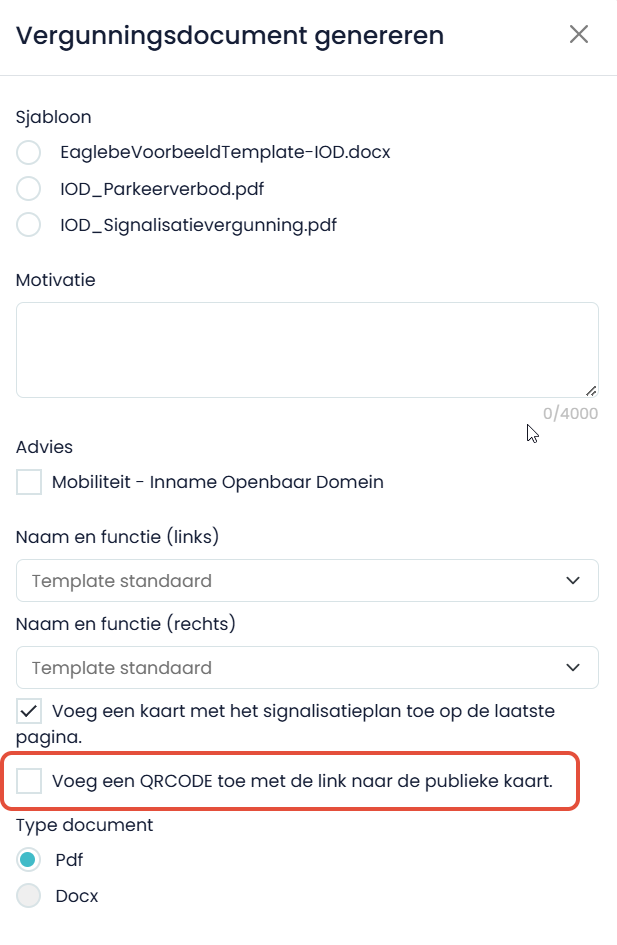 Deze checkbox kan je aanvinken wanneer je de QR-code met link naar de publieke kaart wil toevoegen op de laatste pagina van de template. Op die manier kan de aanvrager op de Eaglebe publieke (en dynamische kaart) de zone met signalisatieplan bekijken. Let op, deze code wordt automatisch toegevoegd aan de laatste pagina van de template en zal de onderliggende info op de template overschrijven. Je kan er ook voor kiezen om de QR code specifiek op een bepaalde plaats te zetten door middel van een veldnaam. Meer info hier kan je daarover hier vinden.