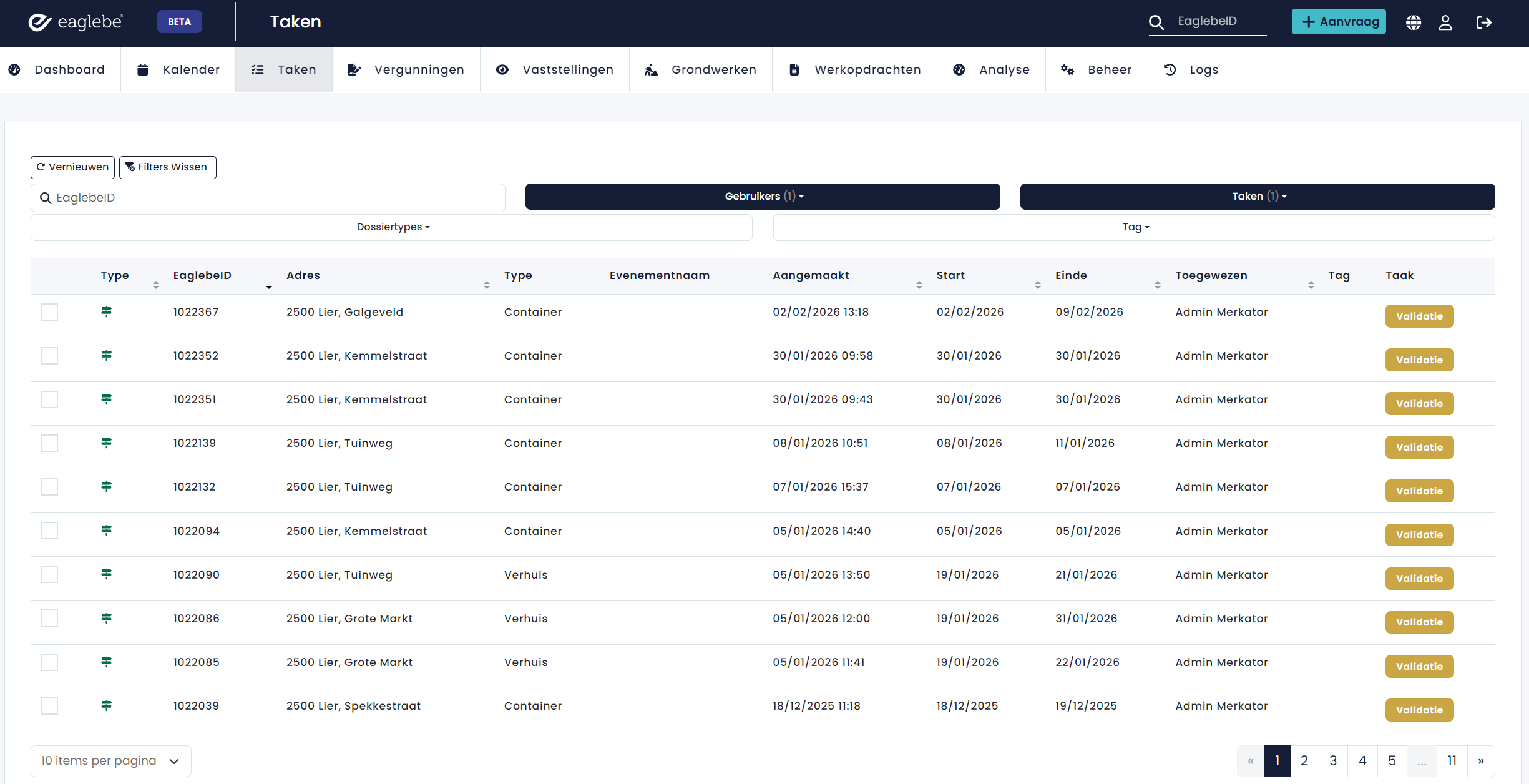 In het Taken Menu van Eaglebe, zijn alle taken terug te vinden die toegewezen zijn aan de verschillende gebruikers binnen Eaglebe. Standaard zal de lijst van taken openen die toegewezen zijn aan jou als gebruiker. Om een taak uit te voeren, klik je eenvoudig op de desbetreffende taak zodat de detailpagina van het dossier zal openen. Staat je naam niet ingevuld onder ‘Gebruiker’ dan zijn er op dat moment geen taken aan jou toegewezen en zal je de taken van alle gebruikers zien.
