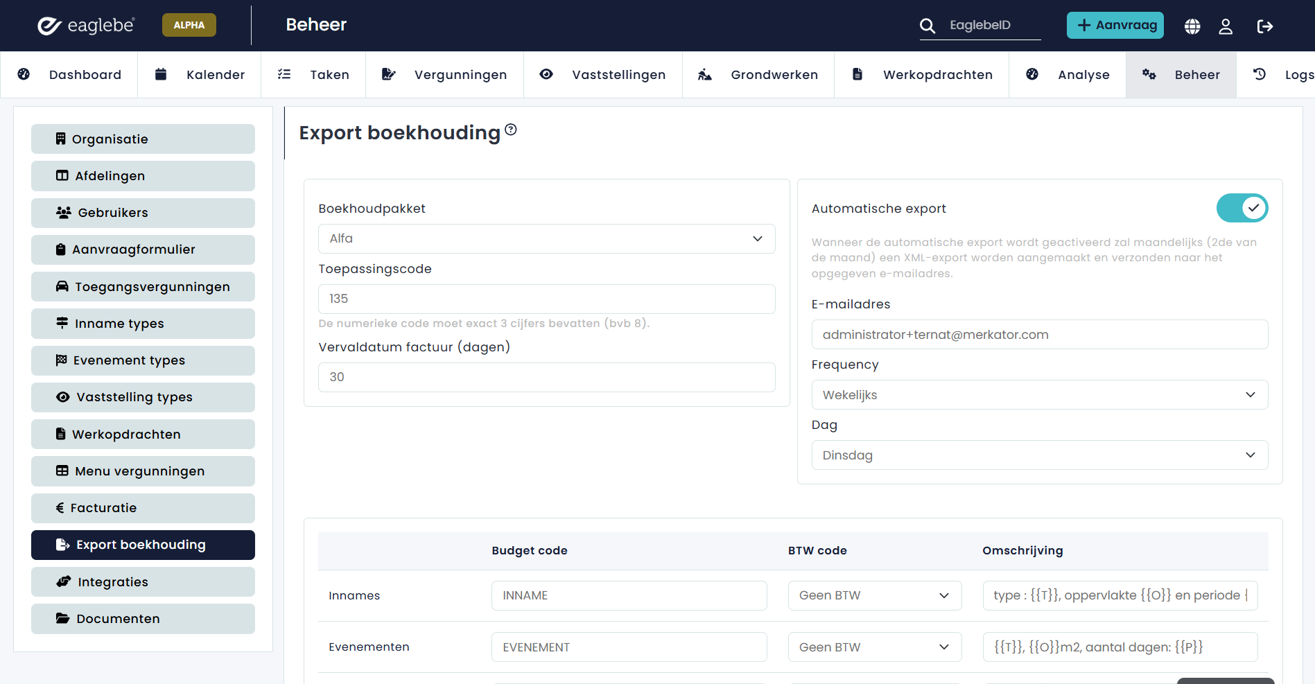Binnen de export naar de boekhouding zal iedere Eaglebe kost (Inname, Evenement, Waarborg, Signalisatie, Nadars, Andere) apart worden opgenomen als detail bij de factuur. Standaard voorzien wij hiervoor een budget code (benaming) en BTW code (21%).