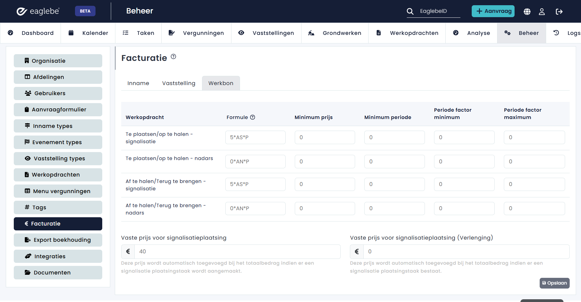 Wanneer er borden worden geplaatst of ontleend, gaat dit meestal ook gepaard met een kost. Deze kostprijs wordt automatisch berekend door Eaglebe op basis van een formule. Deze kan je instellen via het menu 'Beheer - Facturatie - Werkbon'.