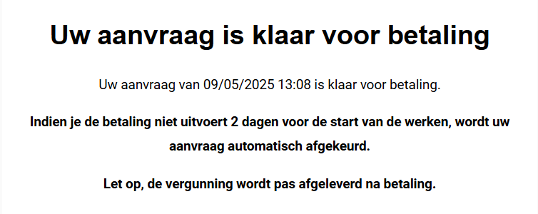 Dit zorgt echter voor problemen in geval van controles of voor het tijdig plaatsen van de nodige signalisatie. Daarom kan het interessant zijn om een betaalherinnering uit te sturen X werkdagen voor de start van de inname. Op deze manier wordt de aanvrager nog eens op de hoogte gebracht dat een betaling nodig is voor het verkrijgen van de vergunning.