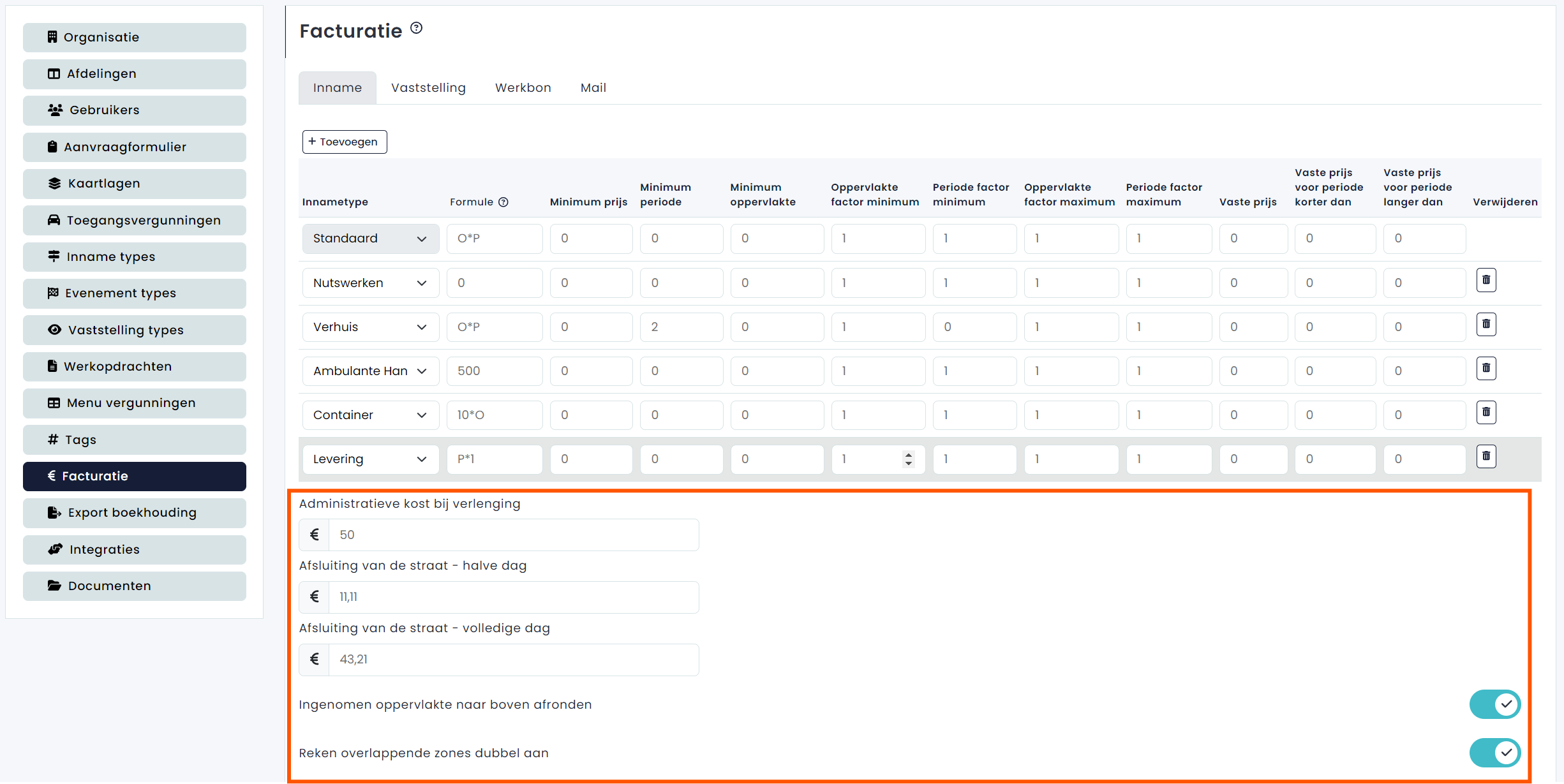 LET OP: Deze facturatie-instellingen werken enkel voor de module Inname Openbaar Domein en dus niet voor de module Evenementen.