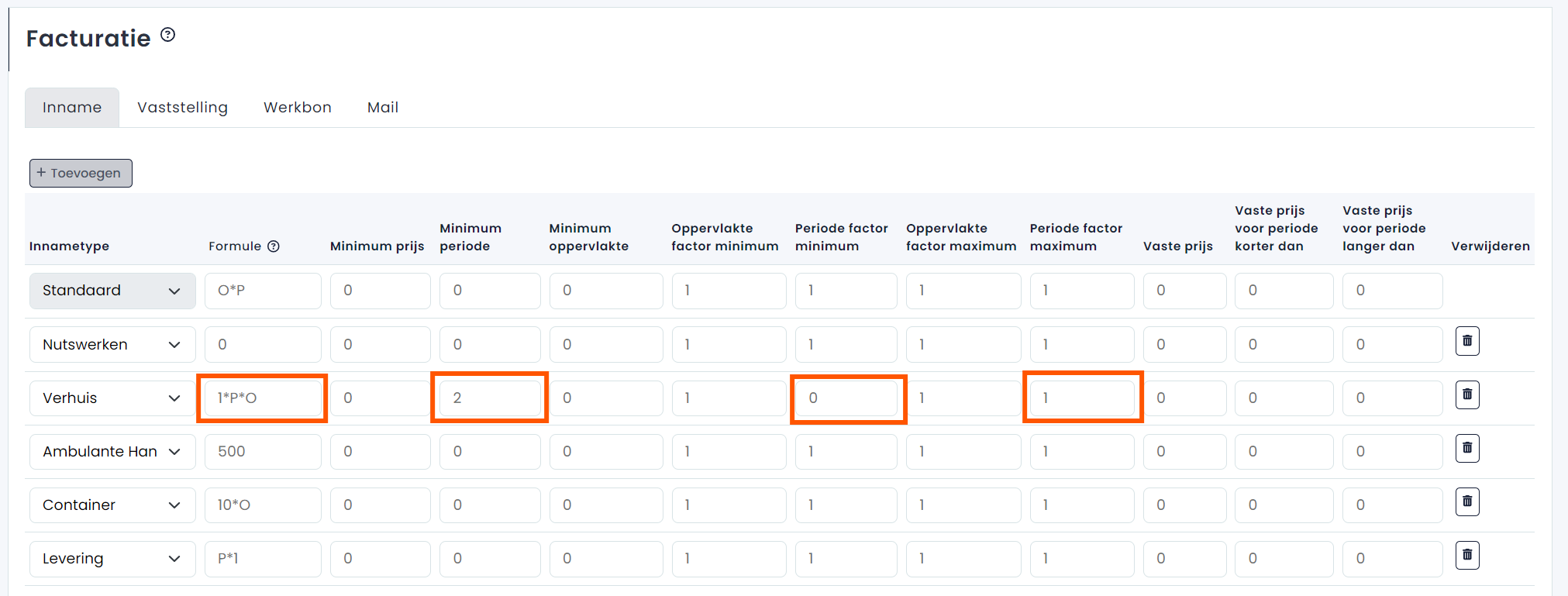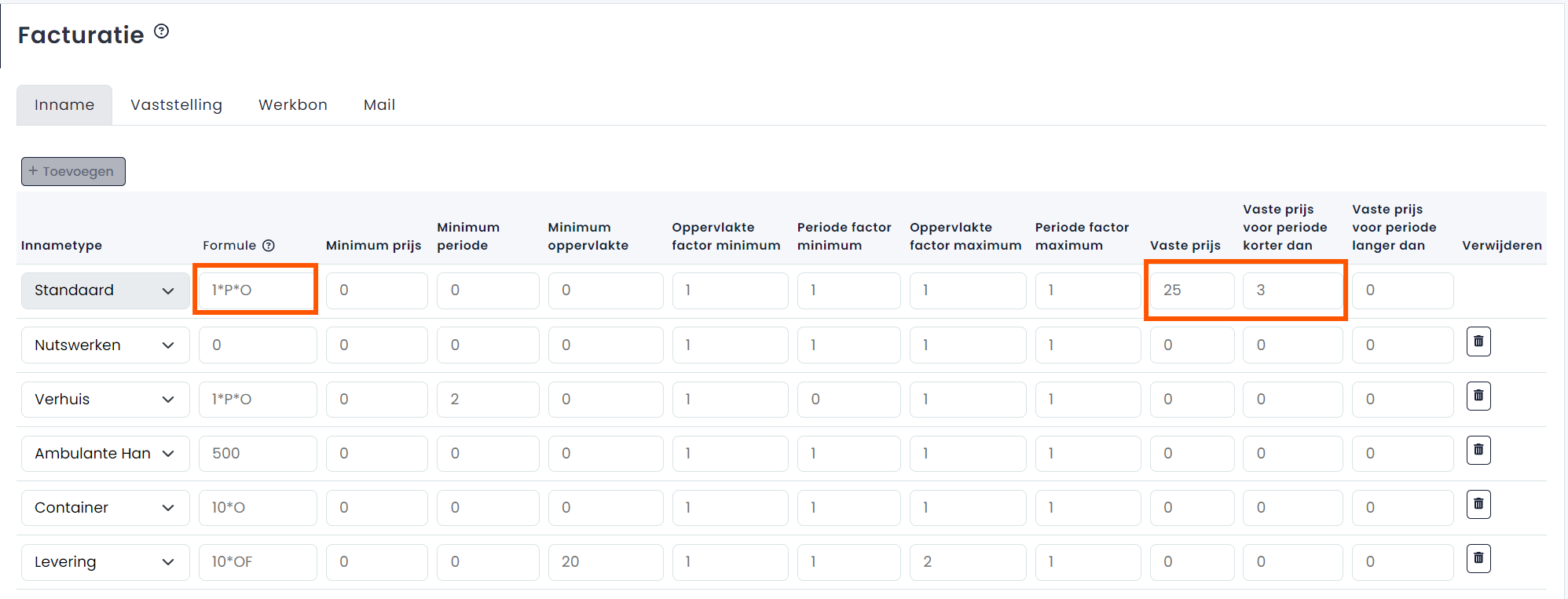 Er kan ook voor een combinatie gekozen worden tussen een vaste prijs en een formule. Een voorbeeld: De eerste 3 dagen wordt er een vaste prijs aangerekend van € 25, vanaf dag 4 herval je op de formule: oppervlakte (O) * periode (P) * Dagtarief