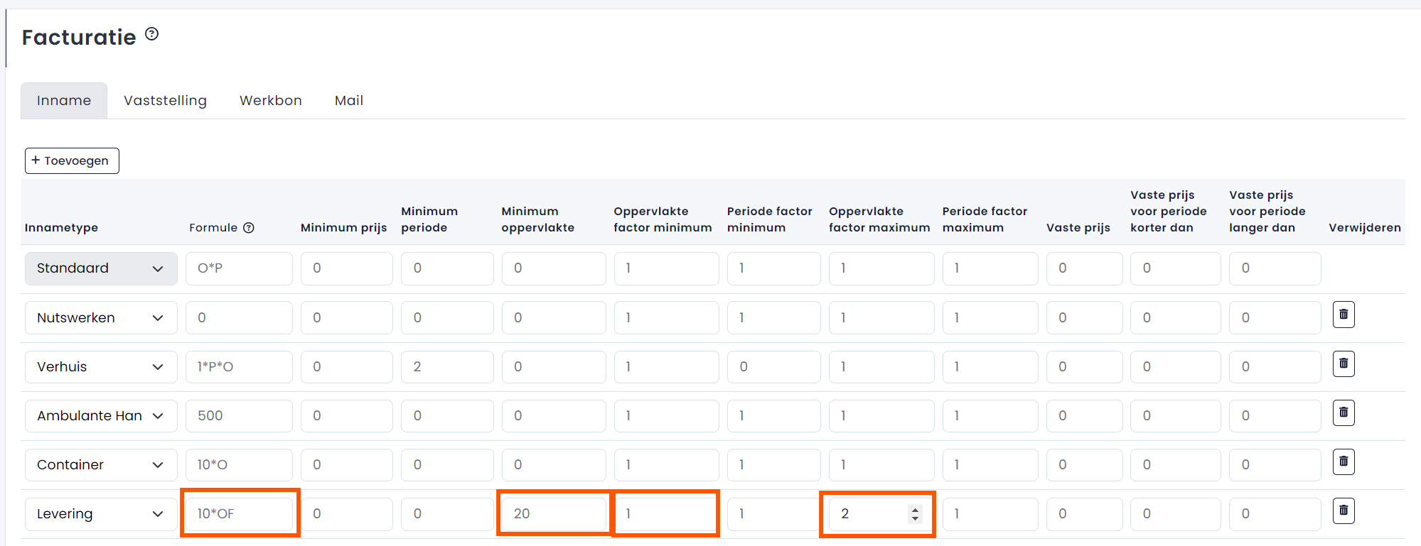 Er wordt dus gebruik gemaakt van een formule (of vaste prijs), Minimum Oppervlakte, Minimum Oppervlakte Factor en Maximum Oppervlakte Factor.