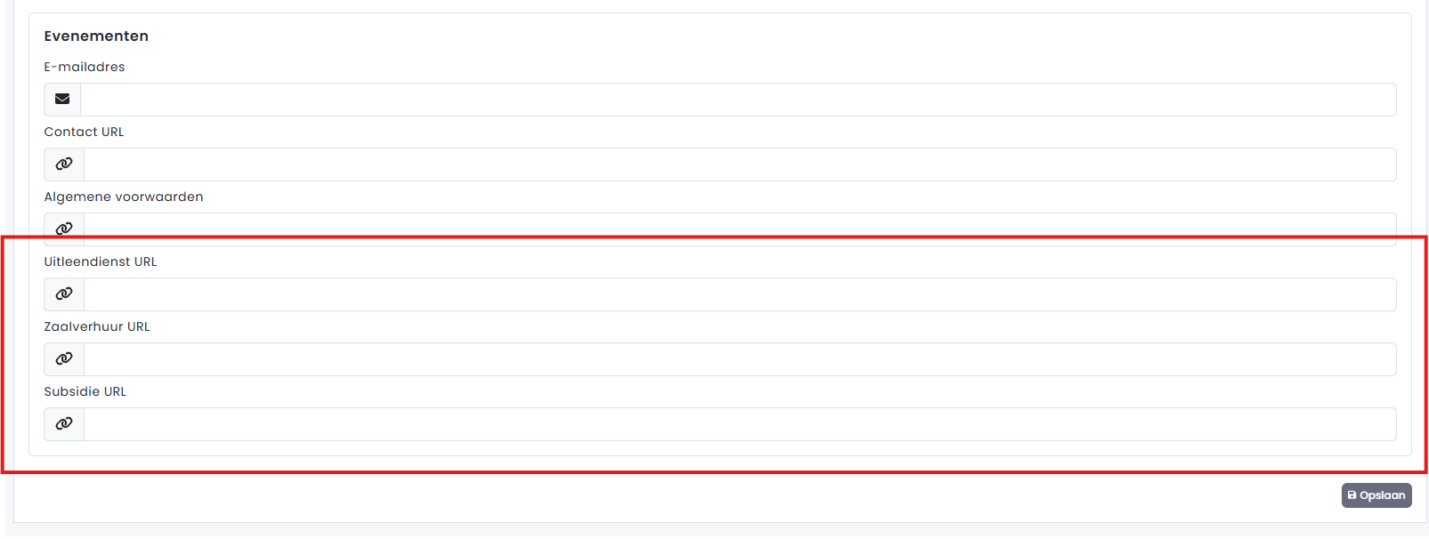 In Beheer - Aanvraagformulier - Web Links, kan je links invoeren naar de respectievelijke websitepagina's die meer info verschaffen over de uitleendienst, zaalverhuur en subsidiemogelijkheden.