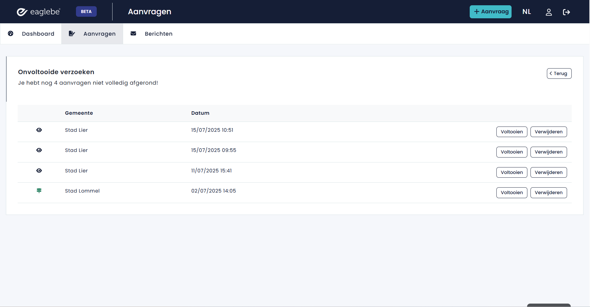 Wanneer je deze kaart aanklikt krijg je een overzicht van al je onvoltooide aanvragen. Per aanvraag kan je kiezen om deze te voltooien via de knop 'Voltooien' of om het concept te verwijderen. Wanneer je klikt op 'Voltooien' wordt de aanvraag geopend in een nieuw tabblad met alle bewaarde parameters. Je kan het formulier dan voltooien en inzenden. Hierna verdwijnt dit uit je concepten en komt dit terecht bij je Aanvragen.