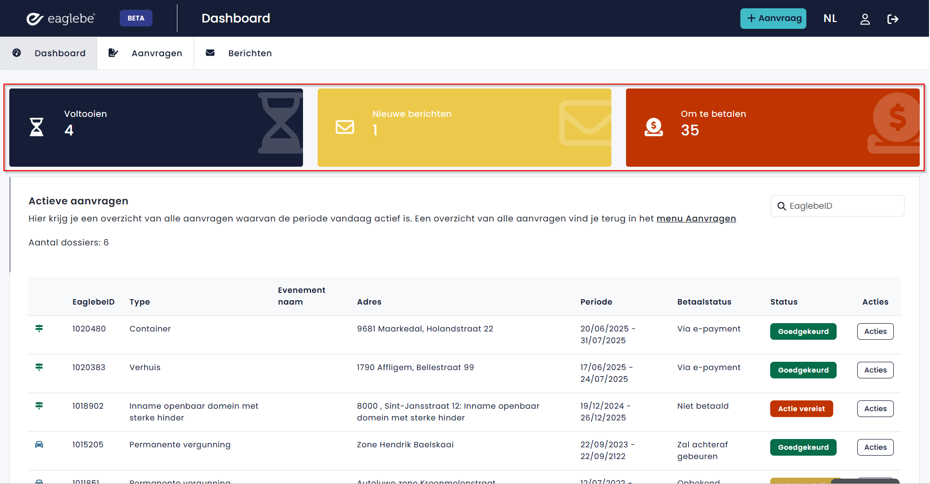 Wanneer je als aanvrager inlogt op je persoonlijke Eaglebe Portaal kom je op je persoonlijk dashboard terecht. Hier krijg je een overzicht van alle acties die je kan/moet uitvoeren en je actieve aanvragen.