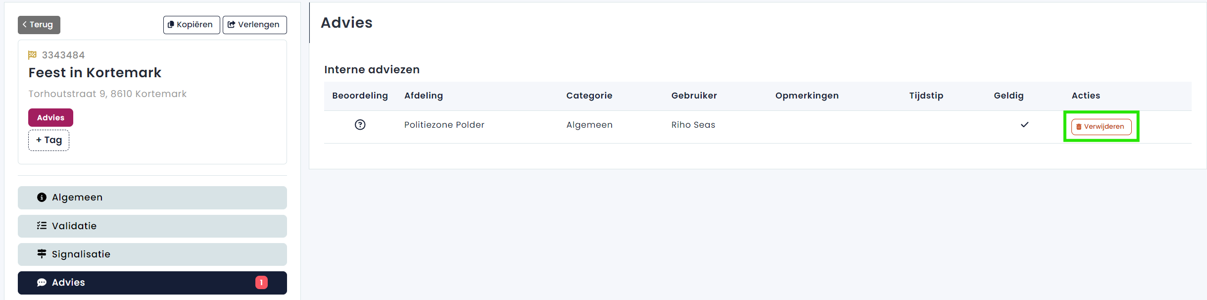 Let op: een advies van de hulpdiensten is niet terughoudend. Indien gewenst kan de adviesvraag richting Riho Seas worden verwijderd om zo het evenement goed- of af te keuren zonder advies van de hulpdiensten. Dit kan via het vuilbak-icoon naast het openstaande advies.
