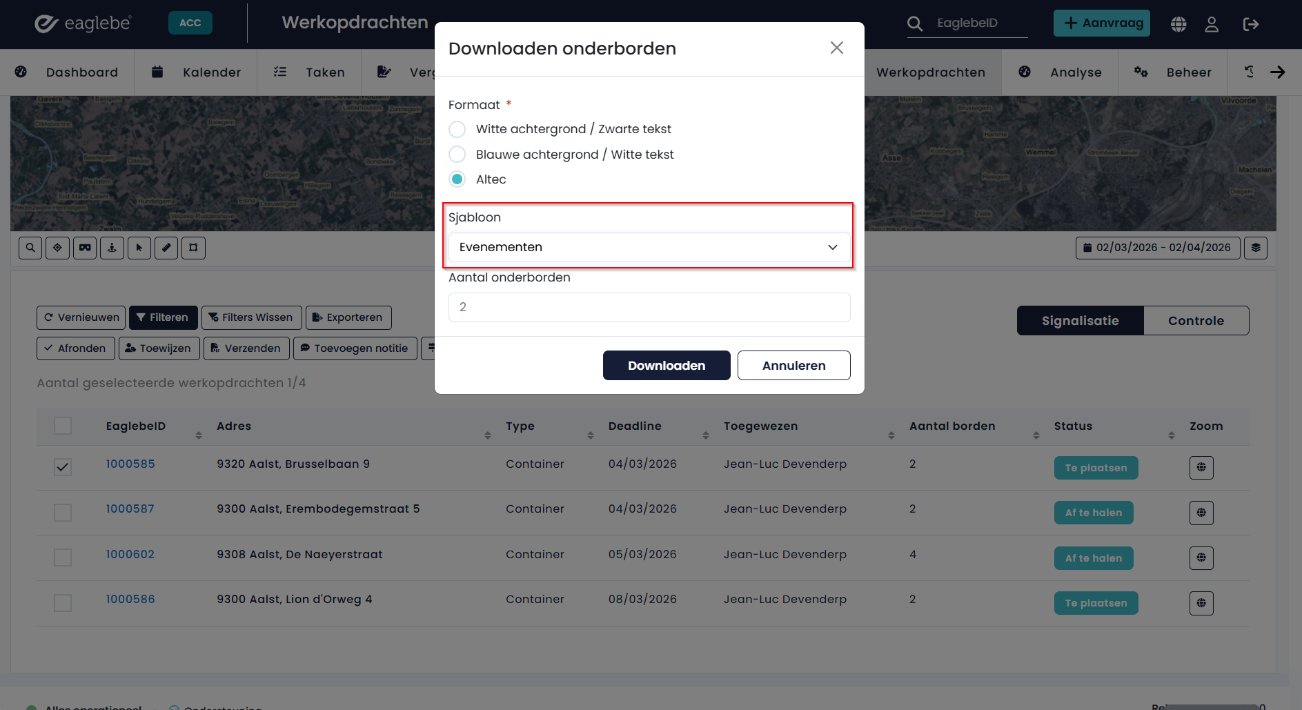 In de pop-up selecteer je het formaat Altec en druk je op 'Downloaden'. De QR codes voor de onderborden worden dan automatisch aangemaakt op basis van de werkopdracht. Gezien deze altijd gekoppeld is aan een signalisatieplan en periode, moet je deze niet meer selecteren.
