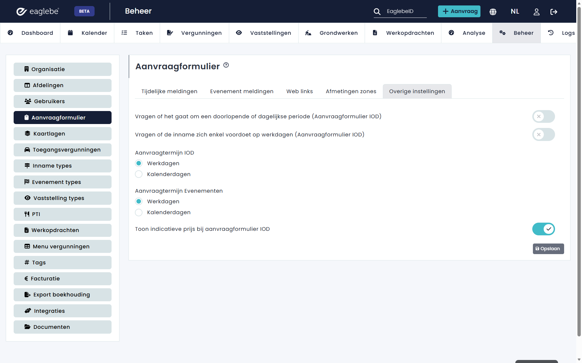- Wil je de aanvrager een samenvatting geven van zijn inname, met het type, de ingenomen oppervlakte, periode en indicatieve kostprijs alvorens de aanvraag wordt ingestuurd? Dan kan je dit activeren via de slider 'Toon indicatieve prijs bij aanvraagformulier IOD'