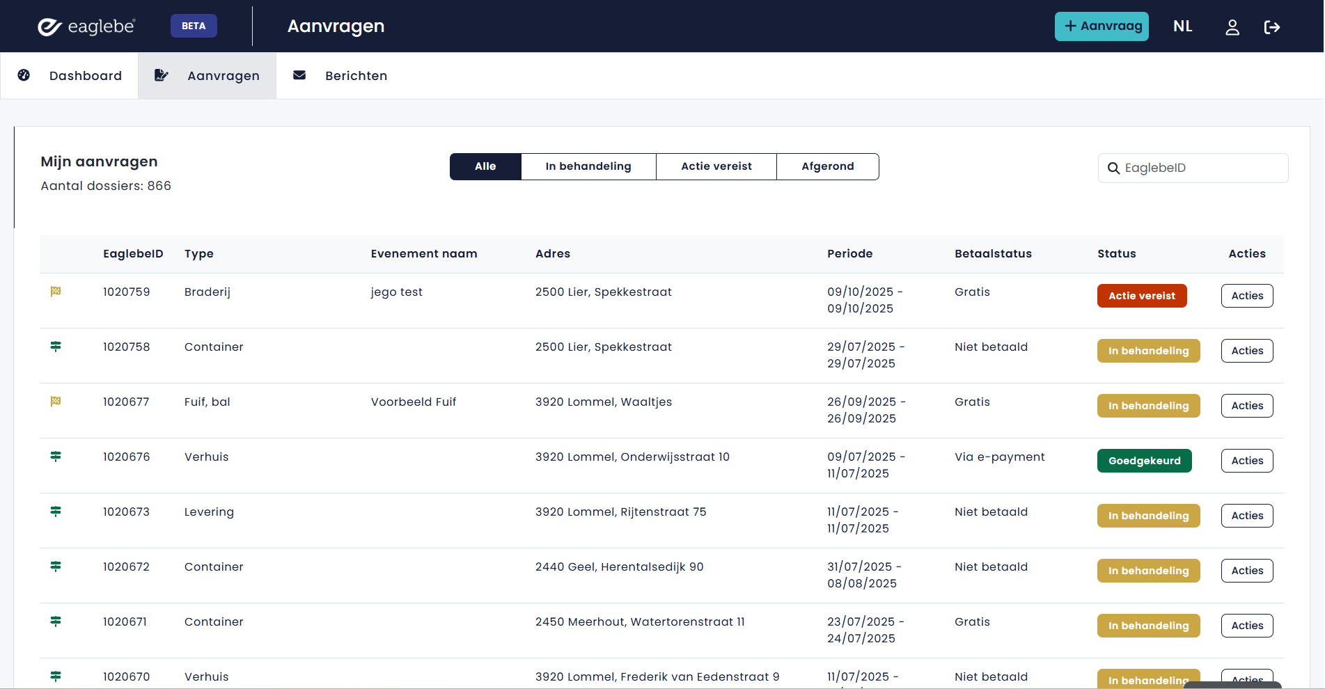 Je kan deze tabel snel filteren op status via de snelfilters bovenaan in het midden van de tabel of je kan een specifiek dossier opzoeken op basis van het EaglebeID via de zoekfilter in de rechterbovenhoek.