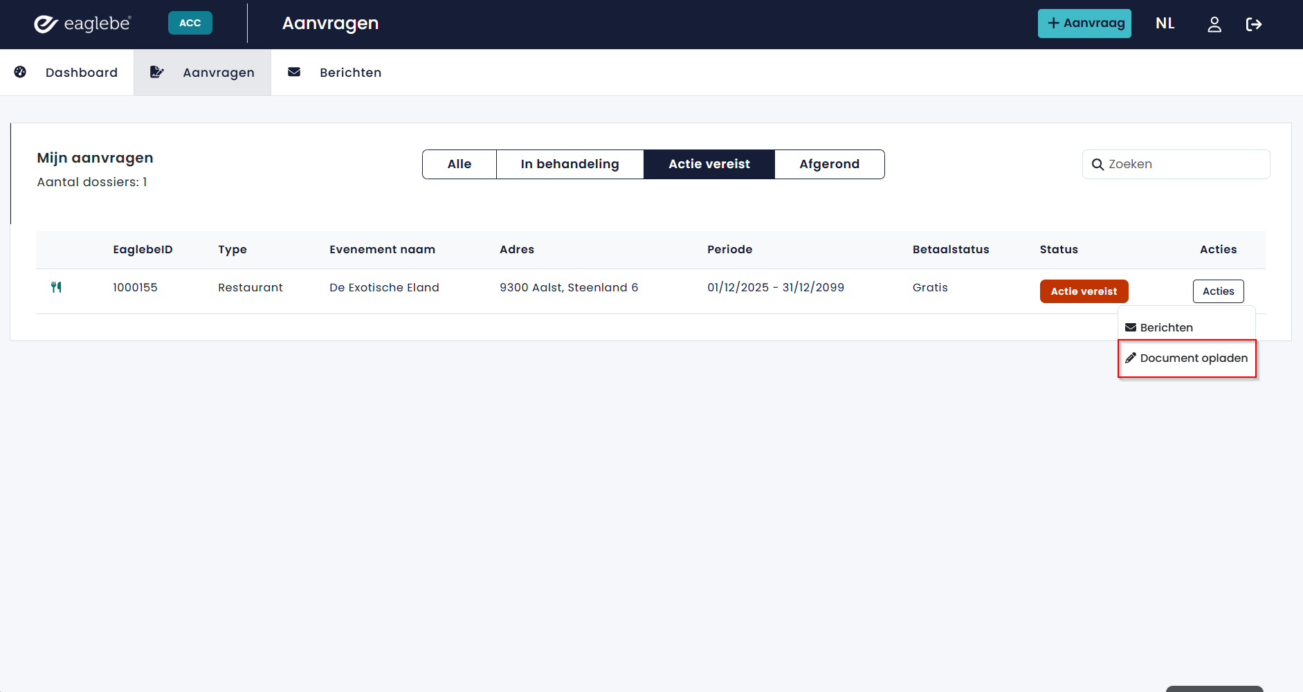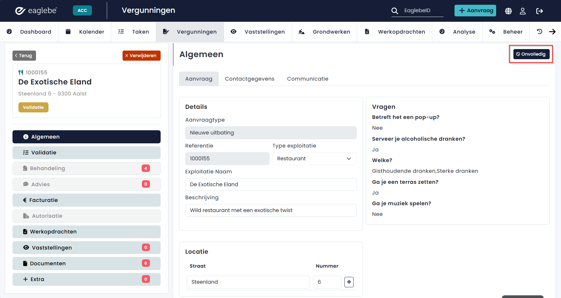 - Onvolledig: indien bepaalde gegevens ontbreken of onduidelijk zijn kan een dossier worden aangeduid als onvolledig. In deze status kan de aanvrager verdere info of bijlagen toevoegen en de aanvraag aanpassen.