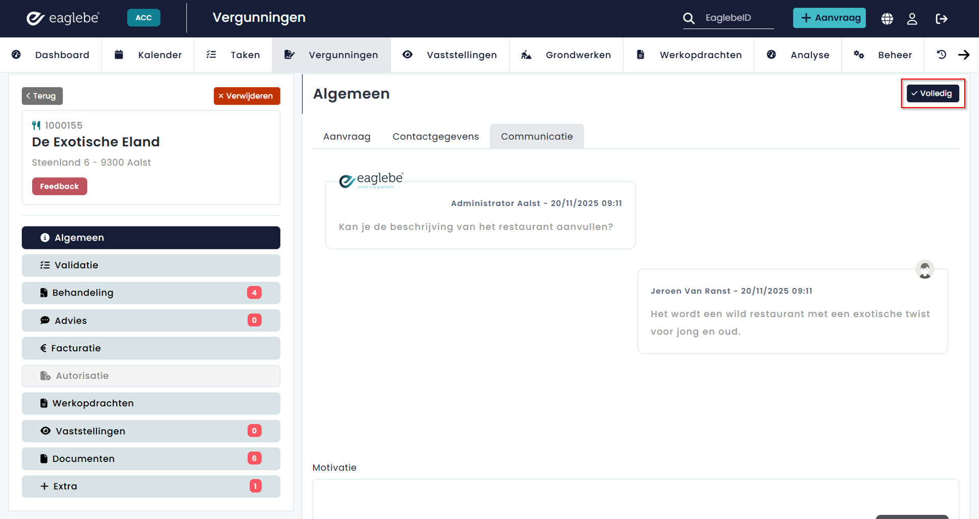 Eens de nodig extra info is verkregen, moet de dossierbehandelaar het dossier aanduiden als volledig via de knop in de rechterbovenhoek. Hierna wordt de communicatie met de aanvrager afgesloten en zijn geen verdere berichten/wijzigingen mogelijk. De aanvraag is dan klaar voor verdere validatie.