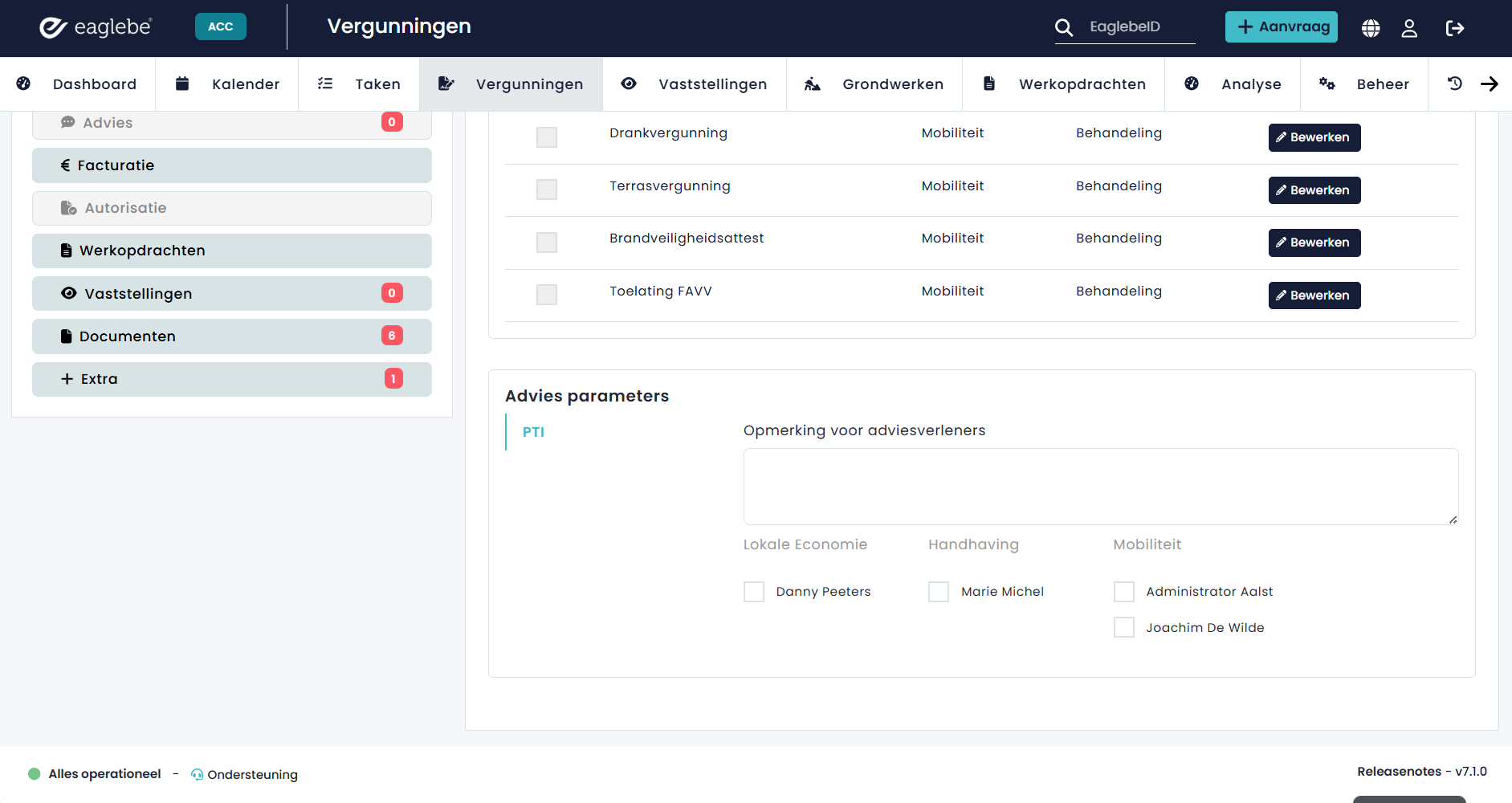 Onder Advies parameters kan je gebruikers selecteren om een algemeen advies op te vragen bij de PTI. Het geven van advies kan na de behandeling van de deelvergunningen en voor de finale autorisatie.