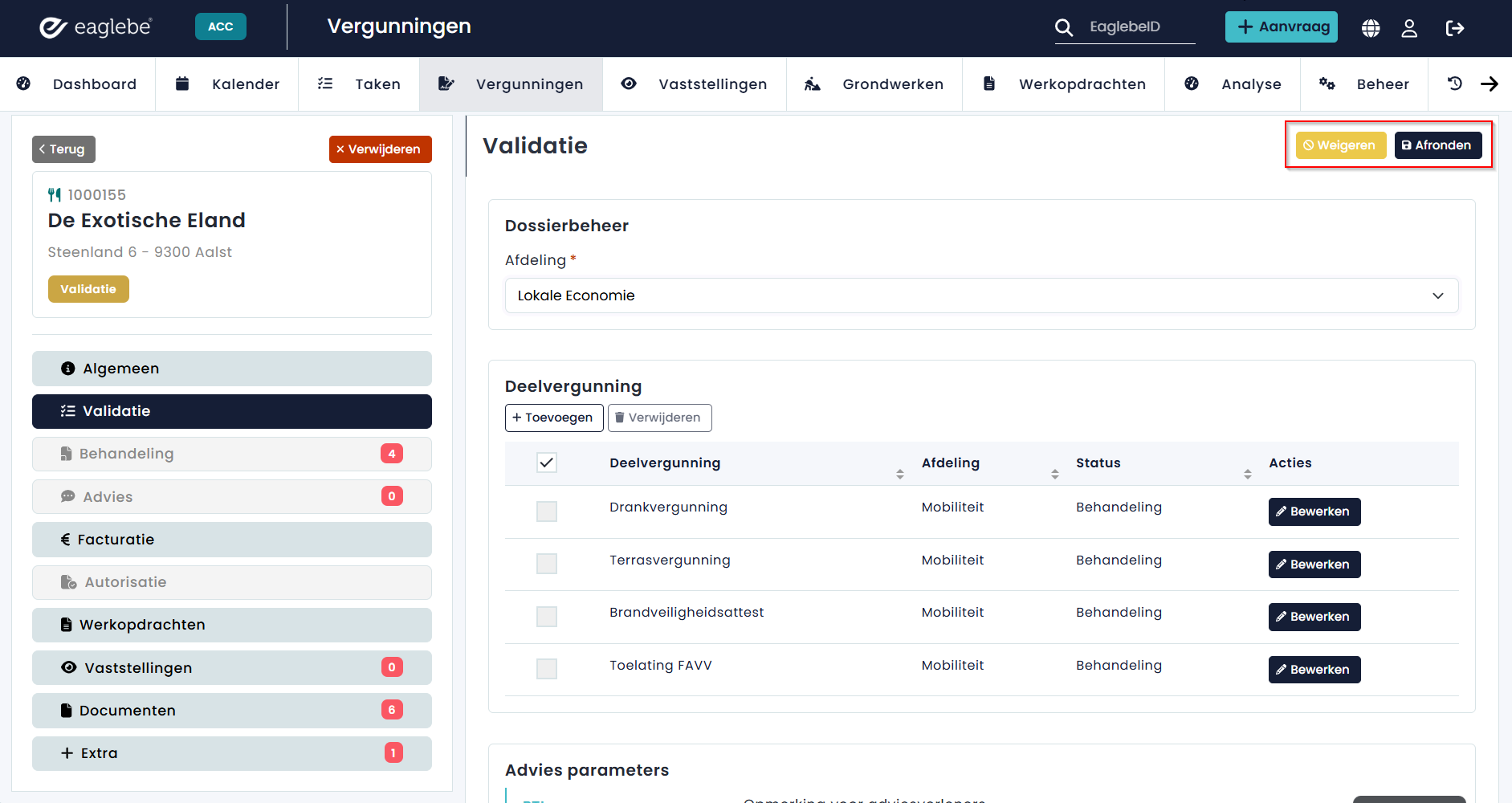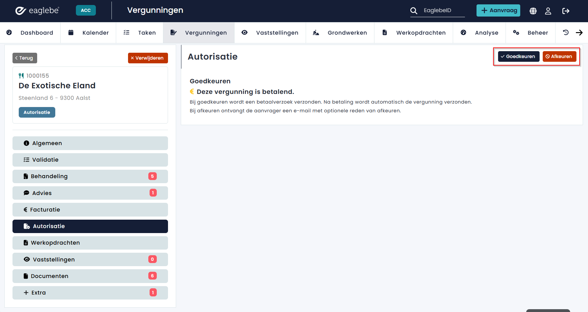 Eens de aanvraag werd gevalideerd, alle deelvergunningen werden beoordeeld en alle adviezen gegeen is het dossier klaar voor de finale Autorisatie. In deze stap zal de dossierbehandelaar het dossier in zijn geheel goed- of afkeuren via de knoppen rechtsboven in het menu Autorisatie.