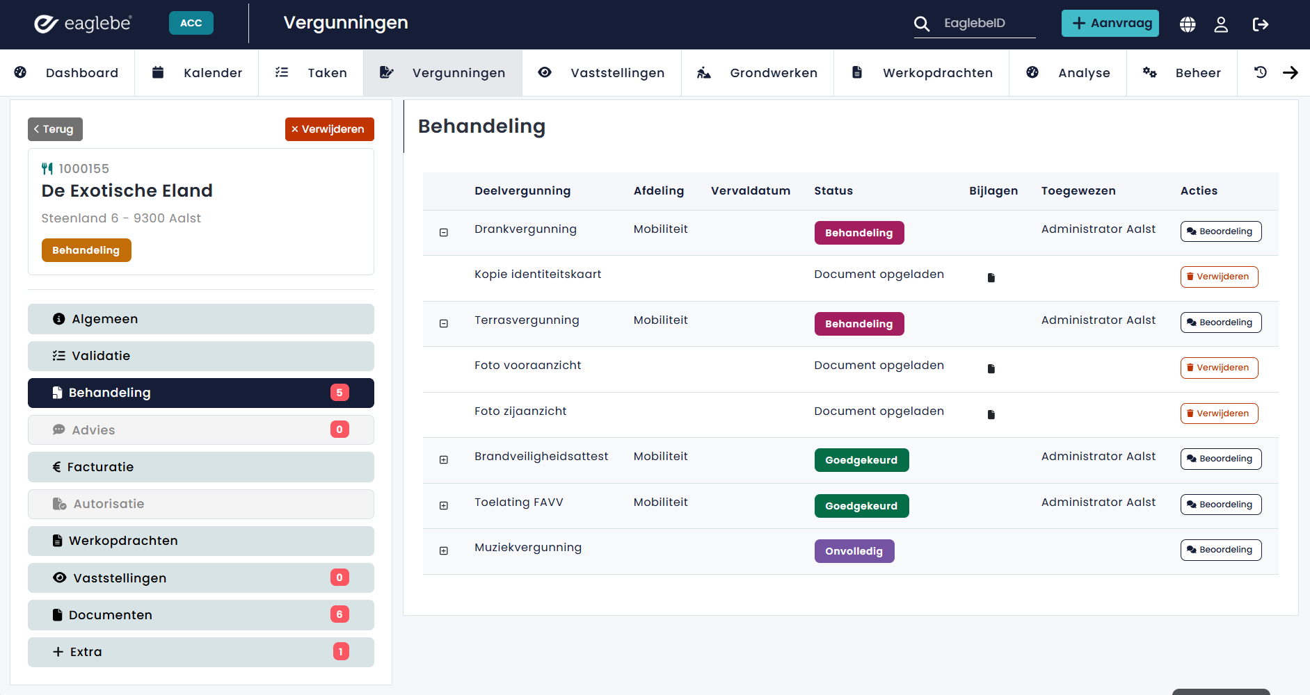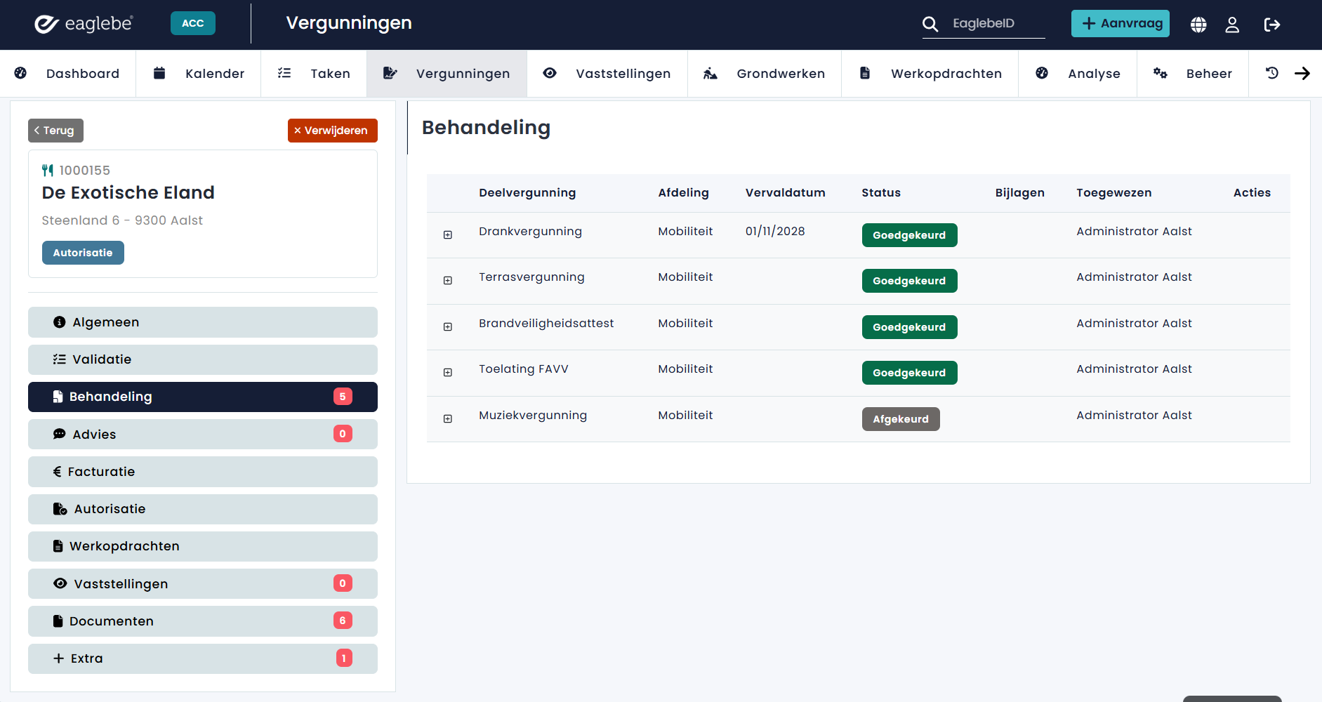 Om een deelvergunning te behandelen ga je naar het menu Behandeling waar je een overzicht krijgt van alle deel-vergunningen gekoppeld aan het dossier. De tabel geeft een duidelijk zicht op: