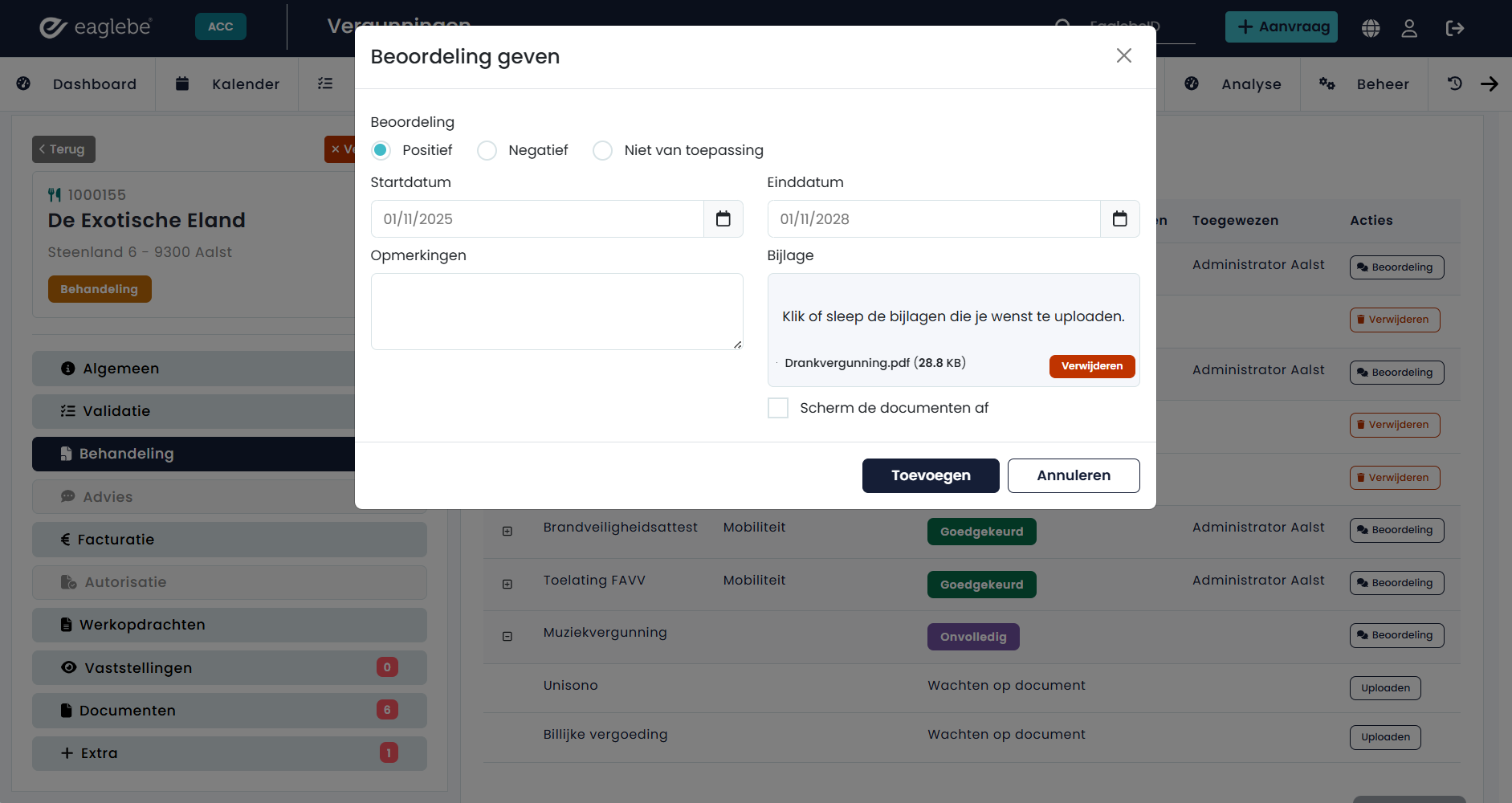 Eens alle gegevens werden ingevuld, kan je de beoordeling geven via de knop Toevoegen rechts onder in de pop-up. Eens alle deelvergunningen werden beoordeeld, gaat het dossier naar de volgende status (afhankelijk van de parameters aangeduid tijdens de Validatie.