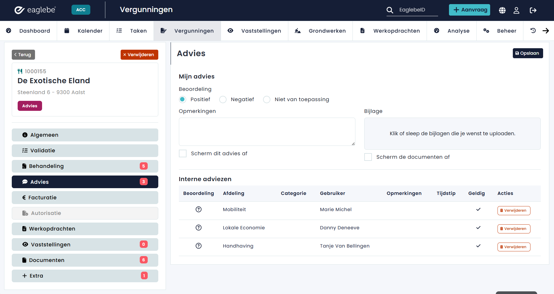 - Bijlagen: documenten of vergunningen die kunnen worden toegevoegd. Deze documenten kunnen worden afgeschermd zodat enkel gerechtigde gebruikers deze kunnen raadplegen.