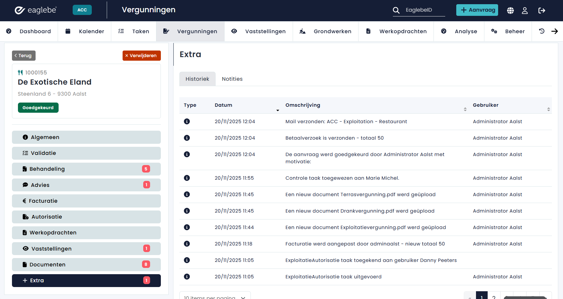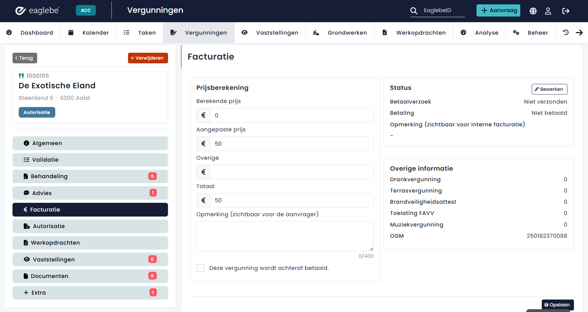 Facturatie is geen aparte status binnen de dossierbehandeling gezien hier geen actie voor nodig is. De facturatie wordt automatisch berekend op basis van de toegevoegde deelvergunningen en hun kostprijs (instelbaar via de beheersinstellingen).