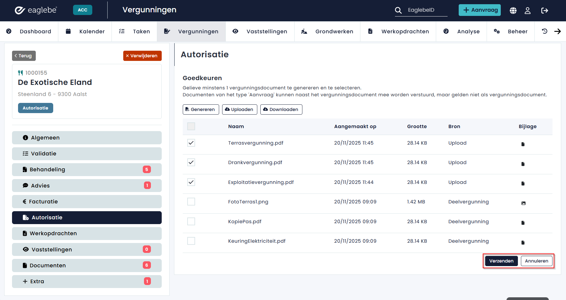 Bij goedkeuring kan je alle documenten selecteren die moeten worden meegestuurd naar de aanvrager. Op deze manier kan je deze in 1 keer de drankvergunning, terrasvergunning en muzieklicentie bezorgen.