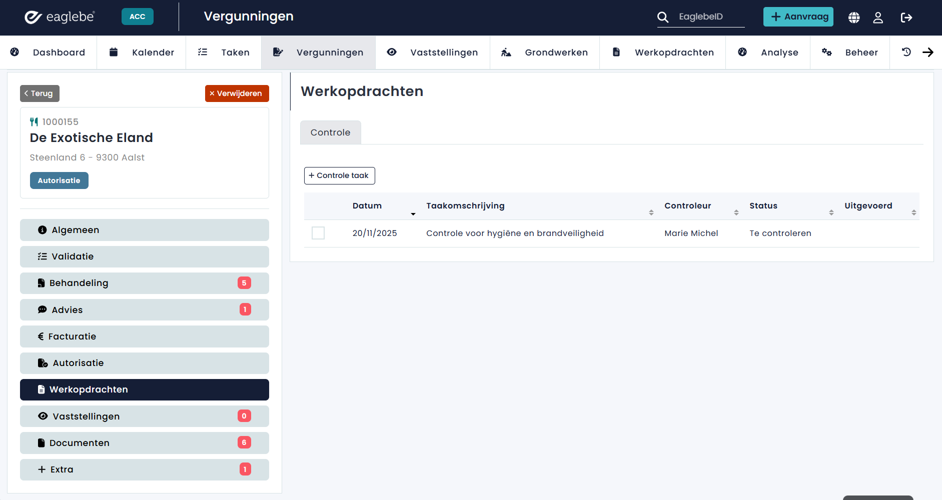 Vooraleer een uitbatingsvergunning kan worden afgeleverd is het vaak noodzakelijk om een controle uit te voeren ter plaatse. Deze controletaken kan je aanmaken binnen het menu Werkopdrachten.