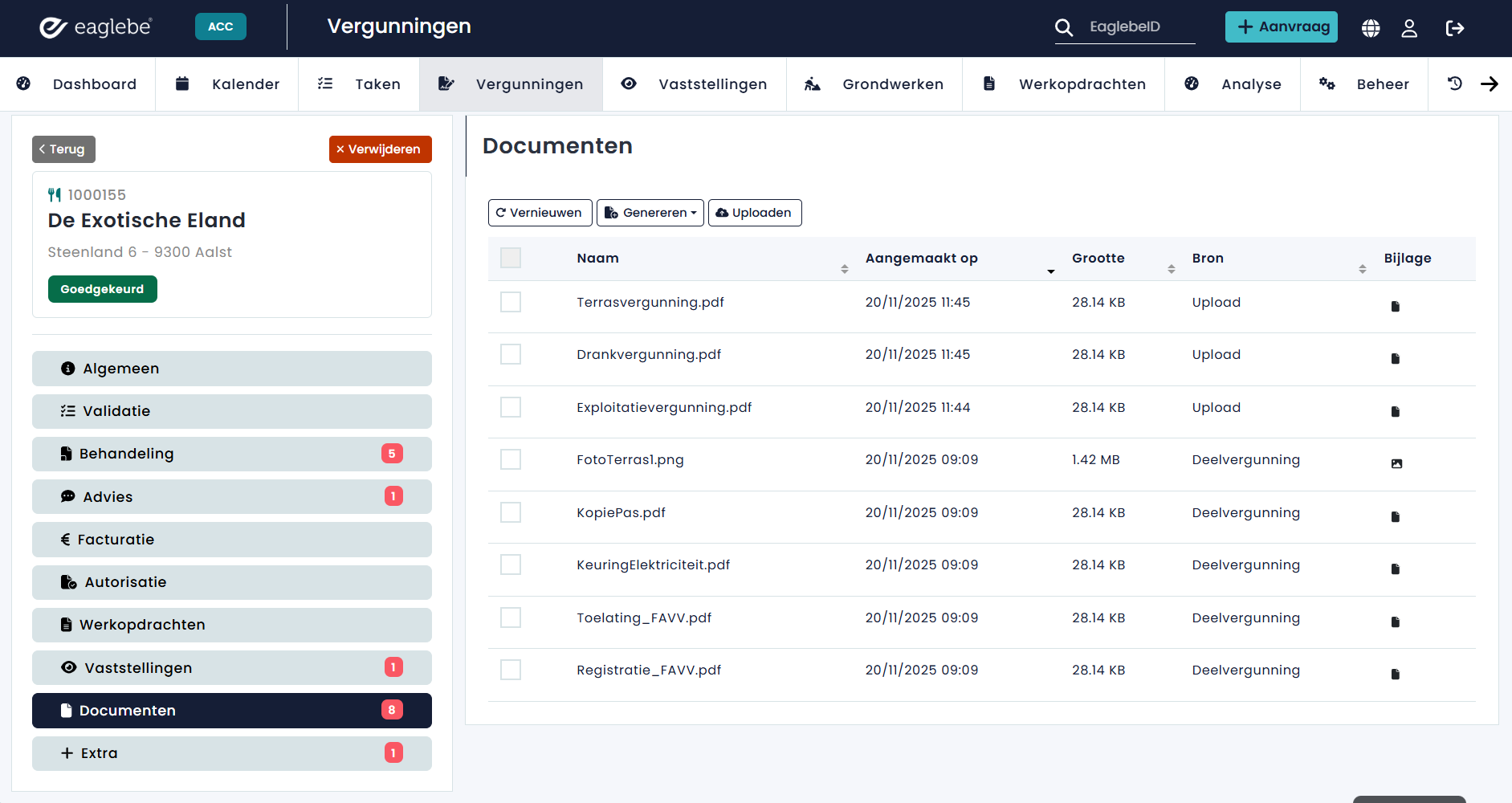 Om een deelvergunning te beoordelen controleer je alle toegevoegde documenten op hun geldigheid. Zijn sommige documenten niet geldig? Dan kan je deze verwijderen en en gaat de deelvergunning naar de status Onvolledig. Hierop wordt de aanvrager via mail op de hoogte gebracht dat hij de ontbrekende documenten opnieuw moet toevoegen via zijn Eaglebe Portaal.